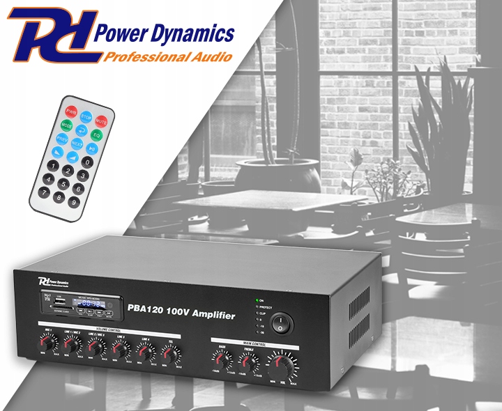 Power Dynamics PBA120 — потужний підсилювач 100 В потужністю 120 Вт. Він оснащений MP3-плеєром, тюнером, Bluetooth і кількома лінійними та мікрофонними входами, тому з цим підсилювачем можна використовувати майже всі аудіоджерела. Щоб правильно налаштувати звук, він оснащений регуляторами низьких і високих частот, а кожен вхід має власний регулятор гучності.