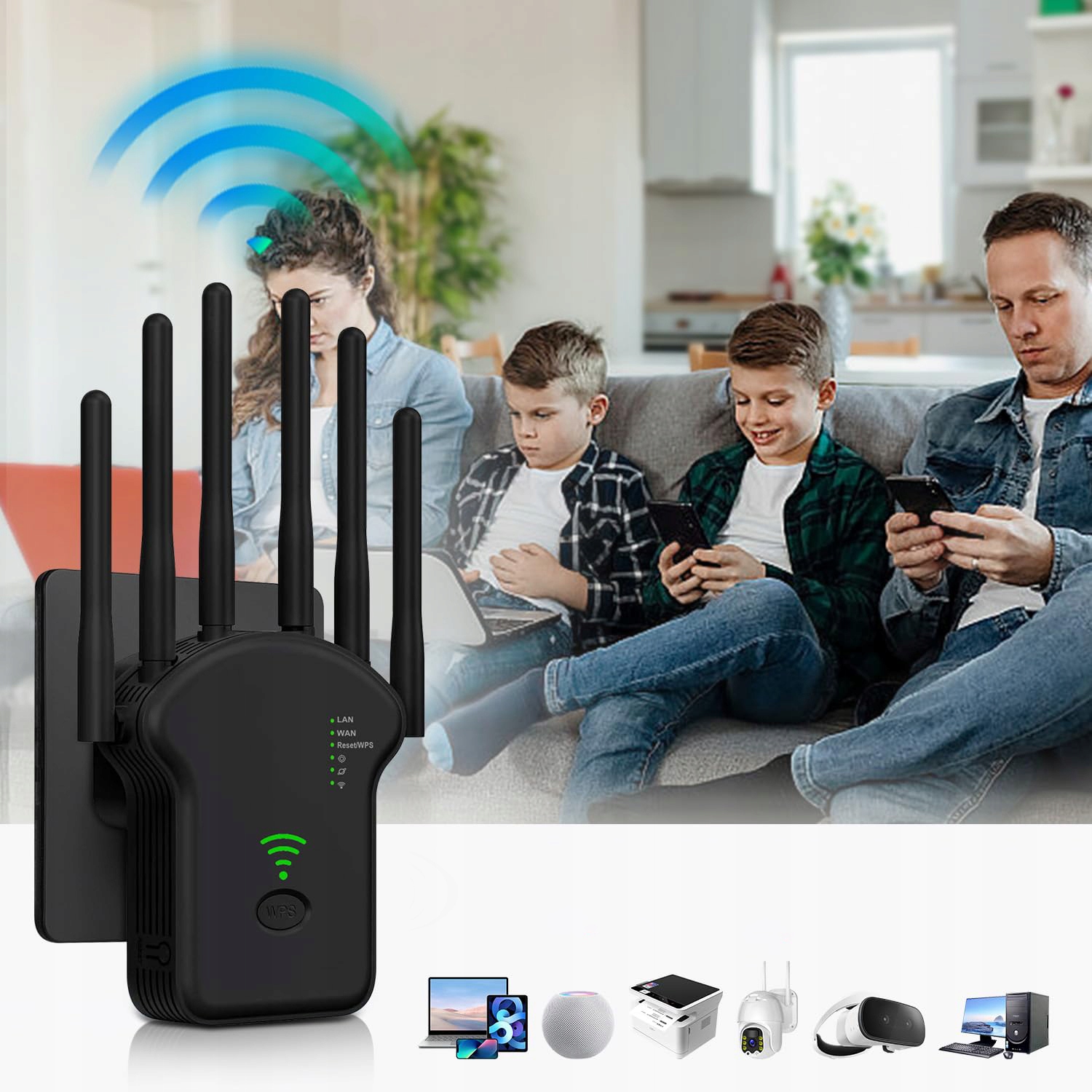 - Поширювач Wi-Fi використовує ефективні мікросхеми останнього покоління, оснащені 6 зовнішніми антенами з високим коефіцієнтом посилення.