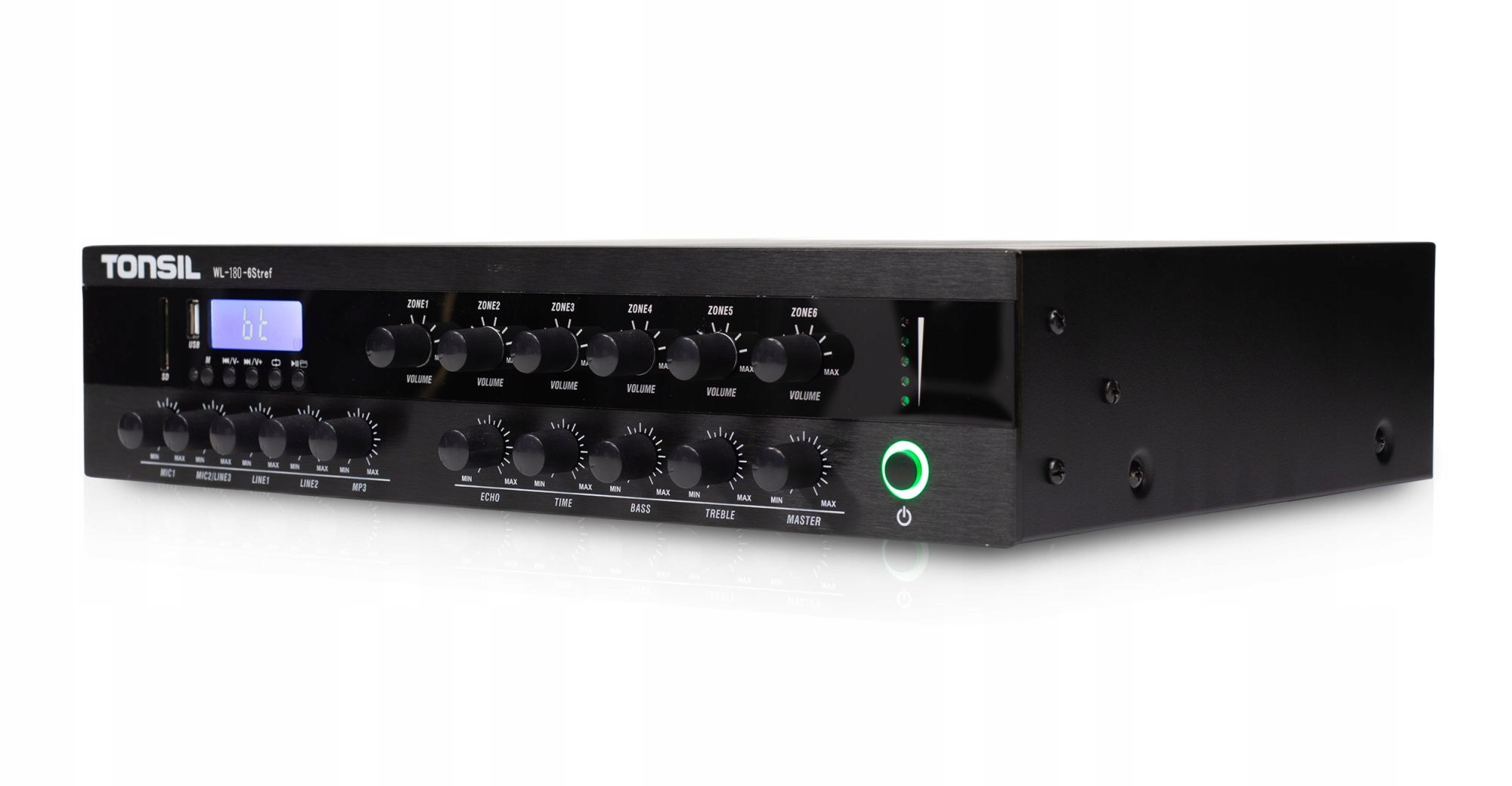 Tonsil WL-180W - це ефективний багатозонний підсилювач, розроблений для 100 В установок (радіовузлів) і зонних систем. Пристрій поєднує в собі потужність 180 Вт з можливістю роботи з 6 незалежними зонами, широким набором джерел (Bluetooth, USB/MP3, SD, FM) і мікрофонними входами для оголошень і презентацій. Міцний стійковий корпус висотою 2U та набір засобів захисту роблять обладнання WL-180W готовим до професійної установки в ресторанах, готелях, магазинах, офісах і громадських закладах.