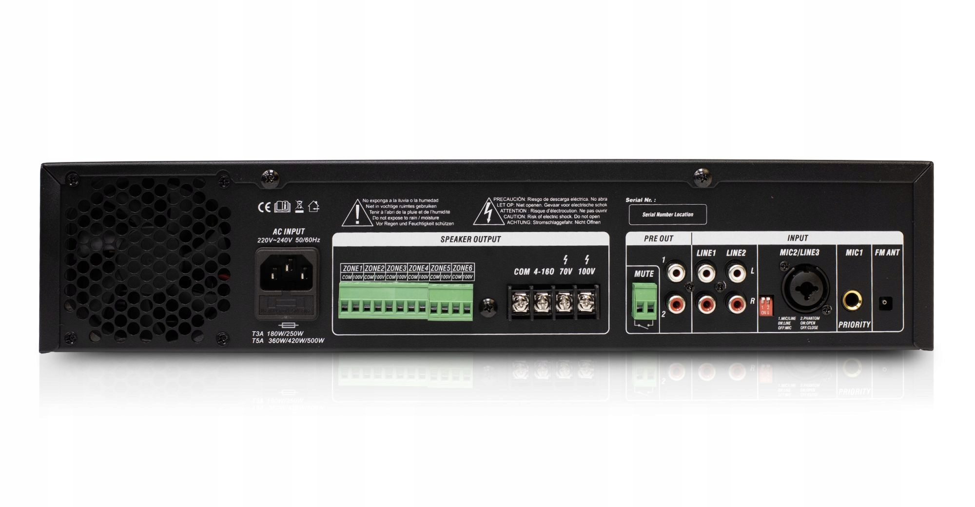 - Аналогові виходи (кількість): 2 - PRE OUT: RCA (лінійний) вихід / вихід попереднього підсилювача) - ВИХІД ДИНАМІКА: термінал динаміка / 100 В (COM + крани 4-16 Ω / 70 В / 100 В)