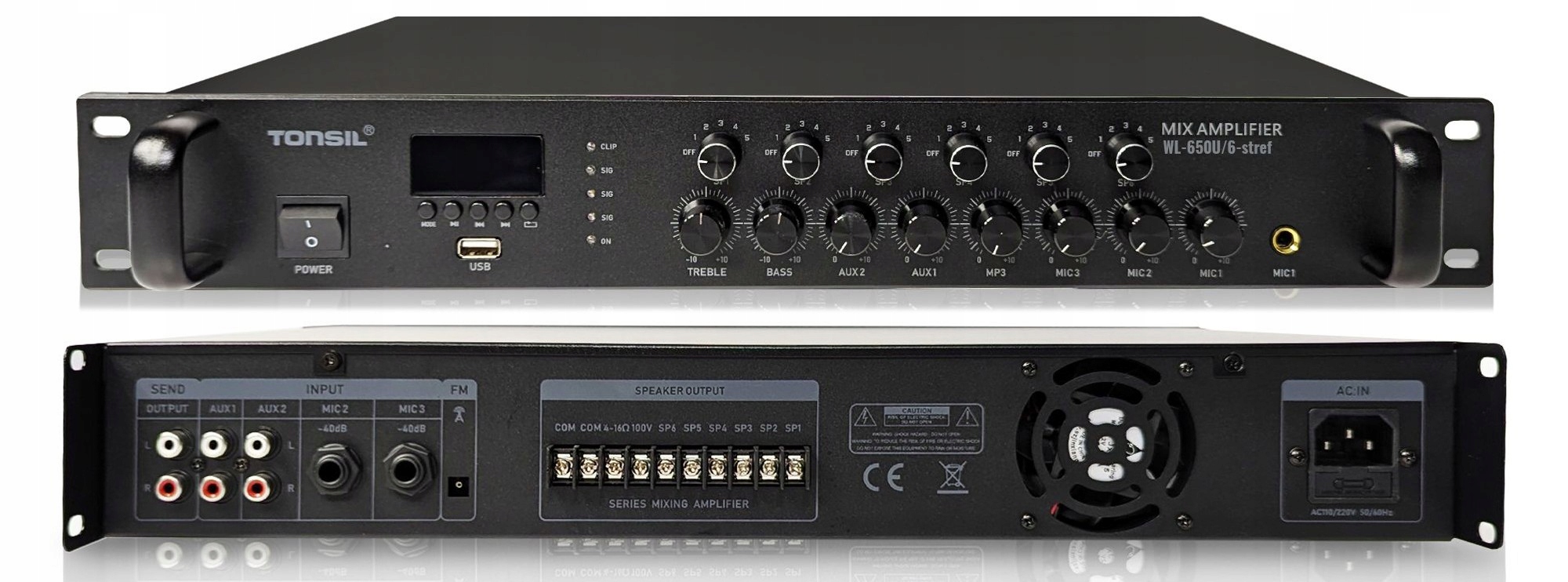 Модель WL-650W - це професійний інсталяційний підсилювач потужністю 650 Вт, призначений для роботи в системах 100 В / 70 В / 4–16 Ом. Завдяки підтримці 6 аудіозон забезпечує повний контроль над звуковою системою в різних частинах будівлі. Пристрій оснащений Bluetooth, USB, MP3 і FM-тюнером, який дозволяє відтворювати музику з багатьох джерел - безпосередньо з телефону, флешки або радіо. Широка частотна характеристика 80 Гц - 18 кГц і дуже низькі спотворення THD < 0,1% гарантують чисте, професійне звучання в будь-якій ситуації.
