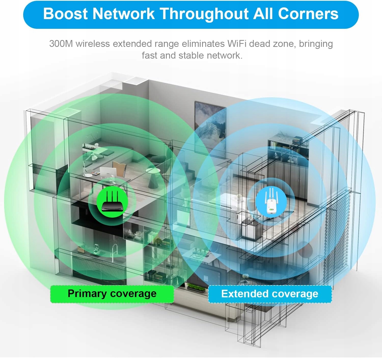 Потужний повторювач WiFi із 4 зовнішніми антенами з високим коефіцієнтом посилення використовує бездротову технологію 11N, яка підтримує стандарт 802.11 n/b/g зі швидкістю до 300 Мбіт/с 2,4 ГГц, що забезпечує стабільний і швидкий сигнал.