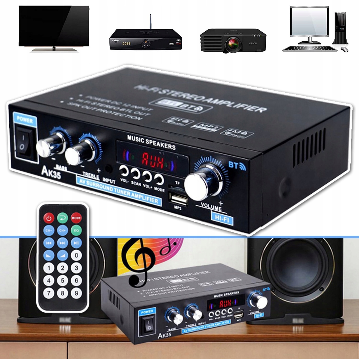 ✅【Керування низькими та високими частотами】Підсилювач звуку AK35 розроблений із регуляторами гучності, висоти та низьких частот для точнішого налаштування звуку, маси задоволення та високої зручності відтворення. Включно з контролером для дистанційного налаштування звуку. Пульт дистанційного керування, що входить у комплект, дозволяє слухати різні звуки та музику з дивана