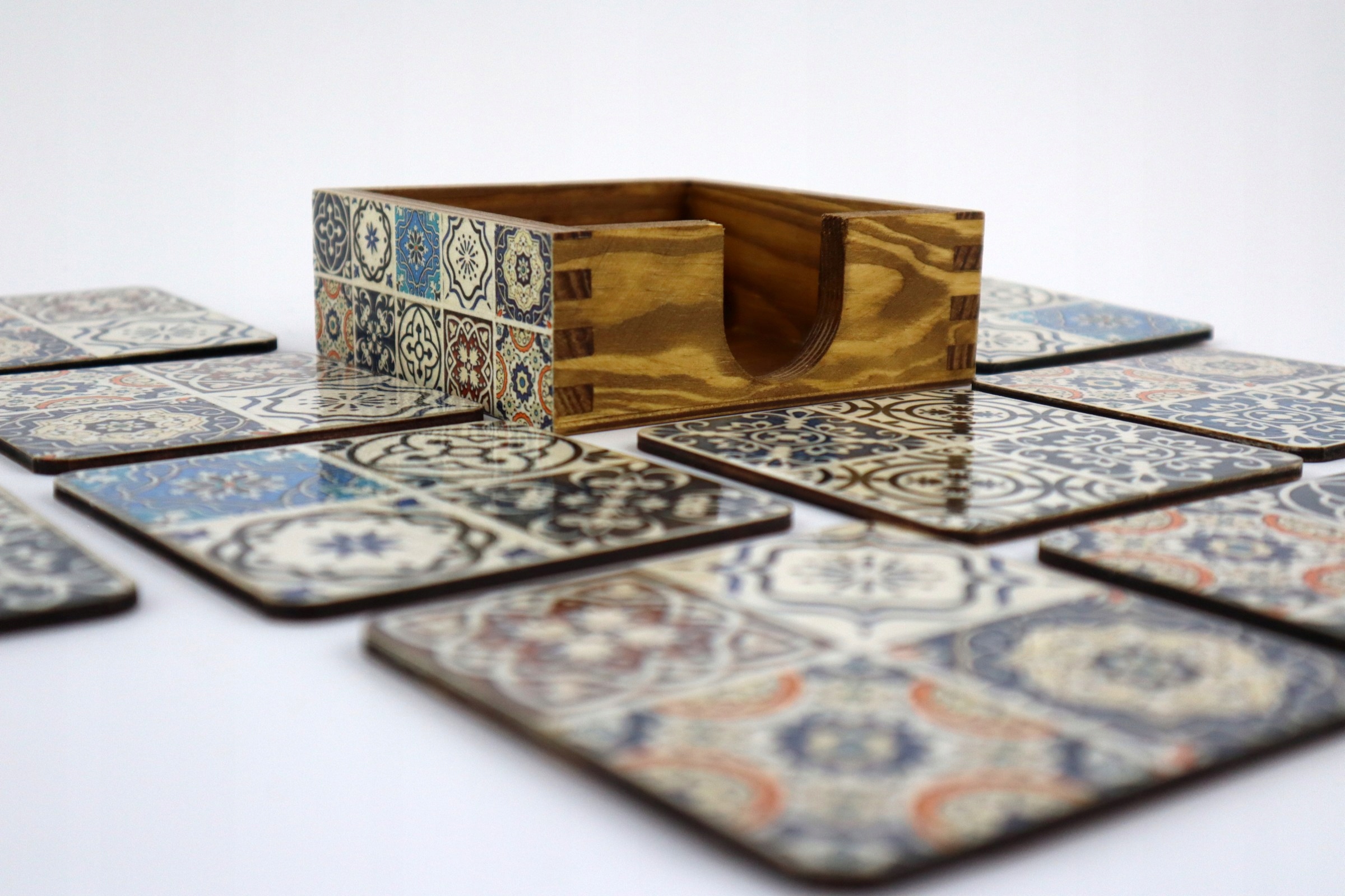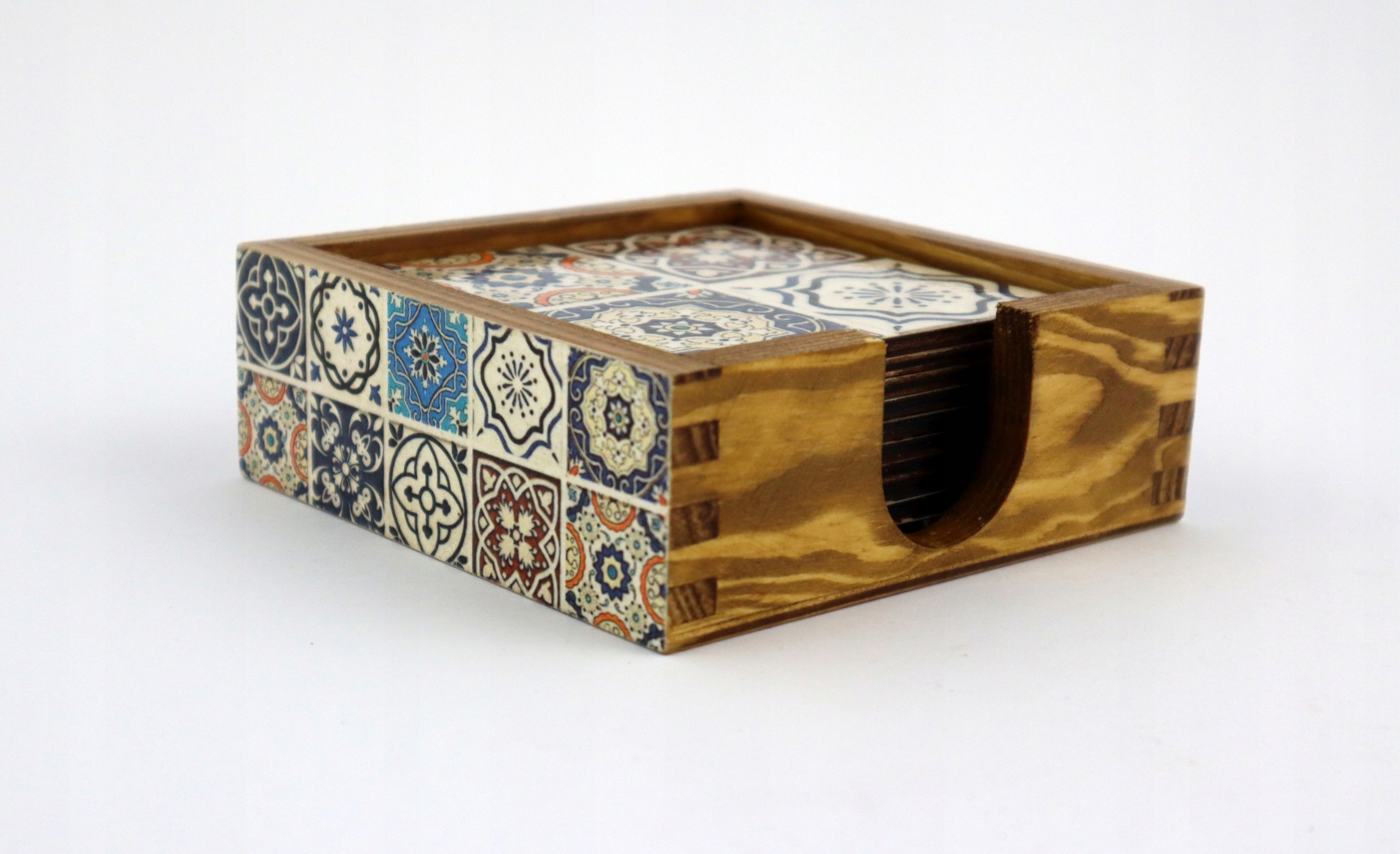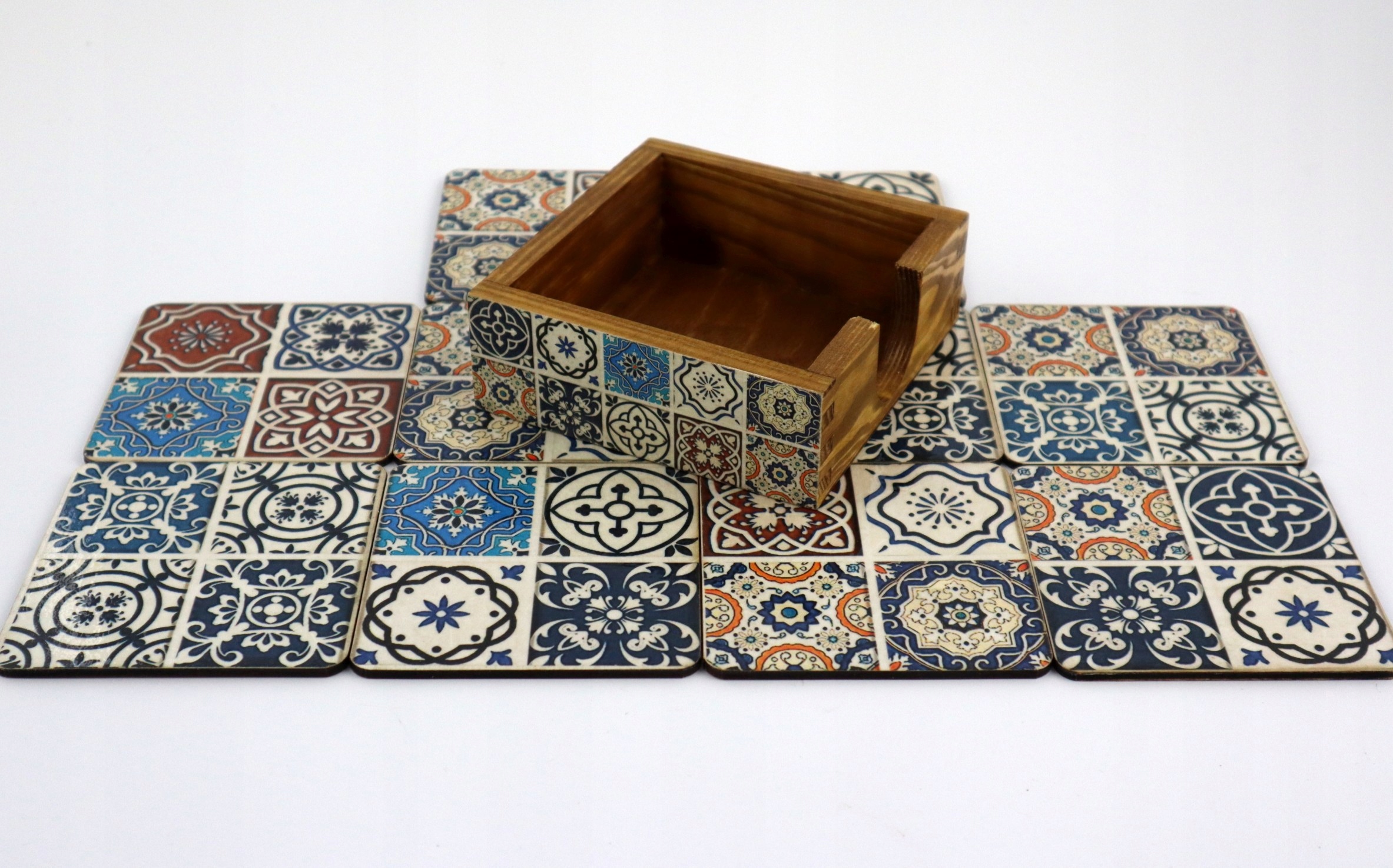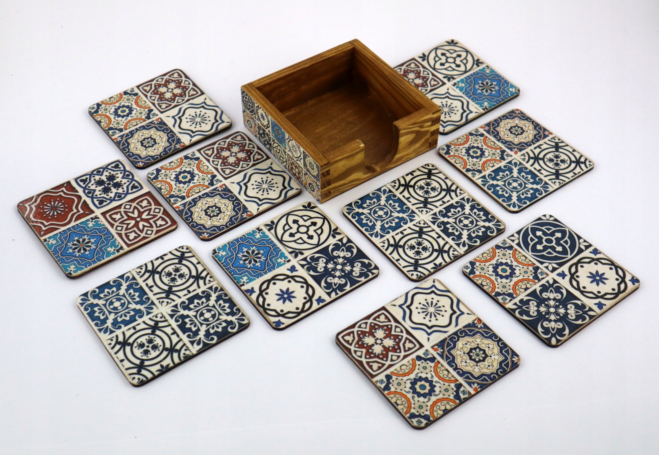 Цей набір складається з 10 дерев’яних підставок, які ідеально підходять для використання під кухлями, кухлями чи свічками, і відкритої дерев’яної коробки.