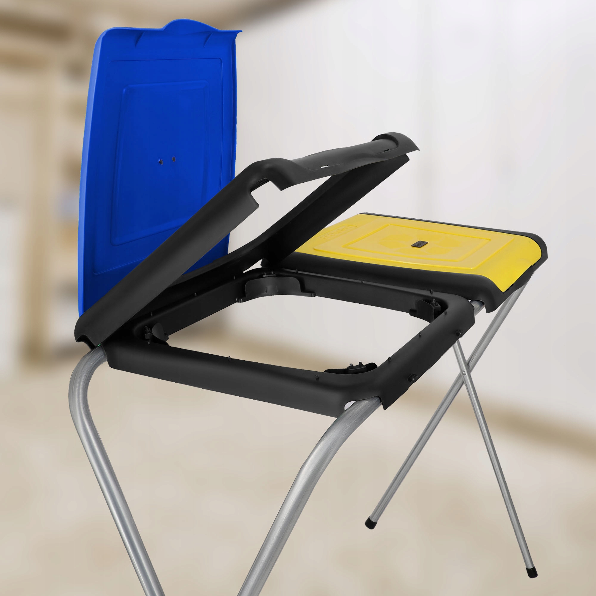 Стелаж для сортування сміття дозволяє зберігати та розділяти різні види відходів. На підставках передбачено місце для пакетів, тому ви можете зручно розділяти певні види відходів. Жовтий призначений для зберігання металів і пластику, а синій — для паперу. Ці підставки не тільки цінуються за їхню функціональність, але й мають відмінну ціну.