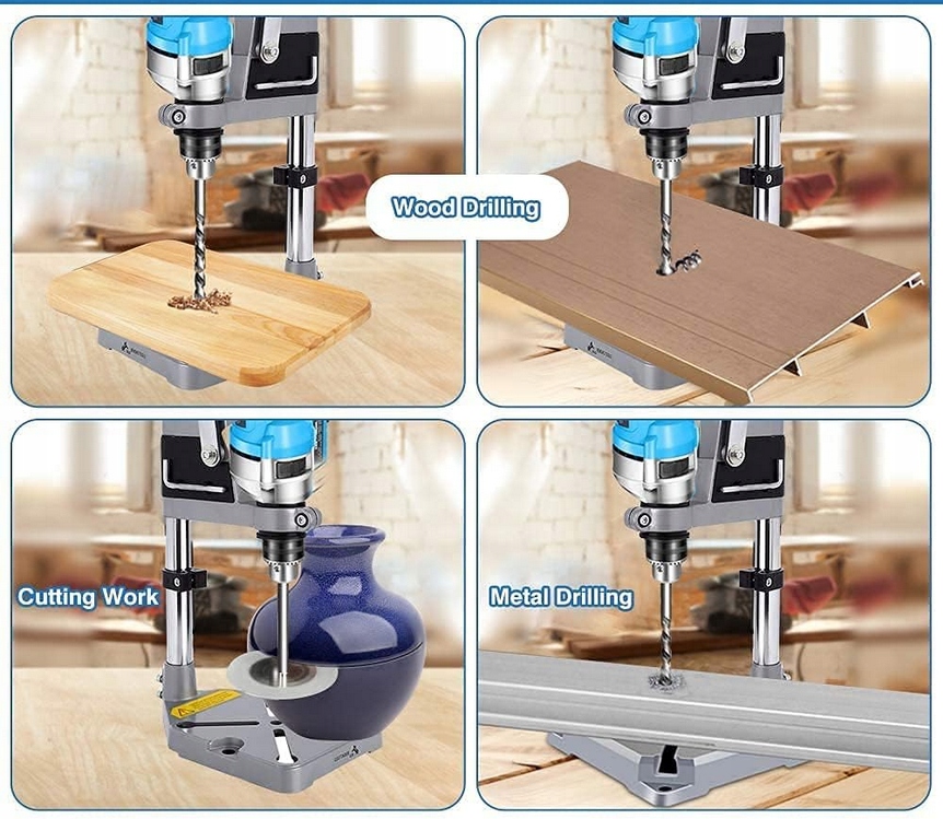 Довговічність,� Ця підставка для свердла дозволяє робити ідеальні отвори в найтвердіших матеріалах, вона ідеально підходить для того, щоб утримувати дриль на місці під час використання, і дозволяє свердлити набагато точніше, ніж під час роботи вручну. ✔ Основа стійки для дрилі достатньо широка, щоб забезпечити стійкість всього обладнання, а також має прорізи для кріплення лещат для міцного затискання матеріалу, що свердлиться.