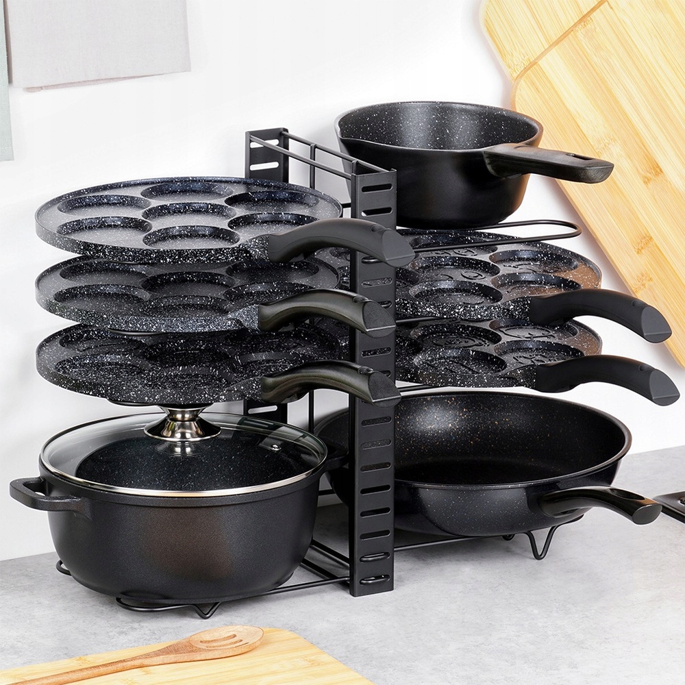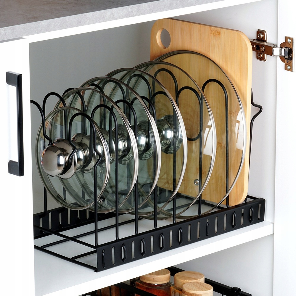 ✅ Дві можливості використання – Підставку можна використовувати в двох варіантах, як самостійний органайзер для кришок, тарілок і обробних дощок або як підставку для каструль, сковорідок і кришок. Це рішення 2-в-1 дозволяє адаптувати систему зберігання до ваших потреб і простору кухні.
