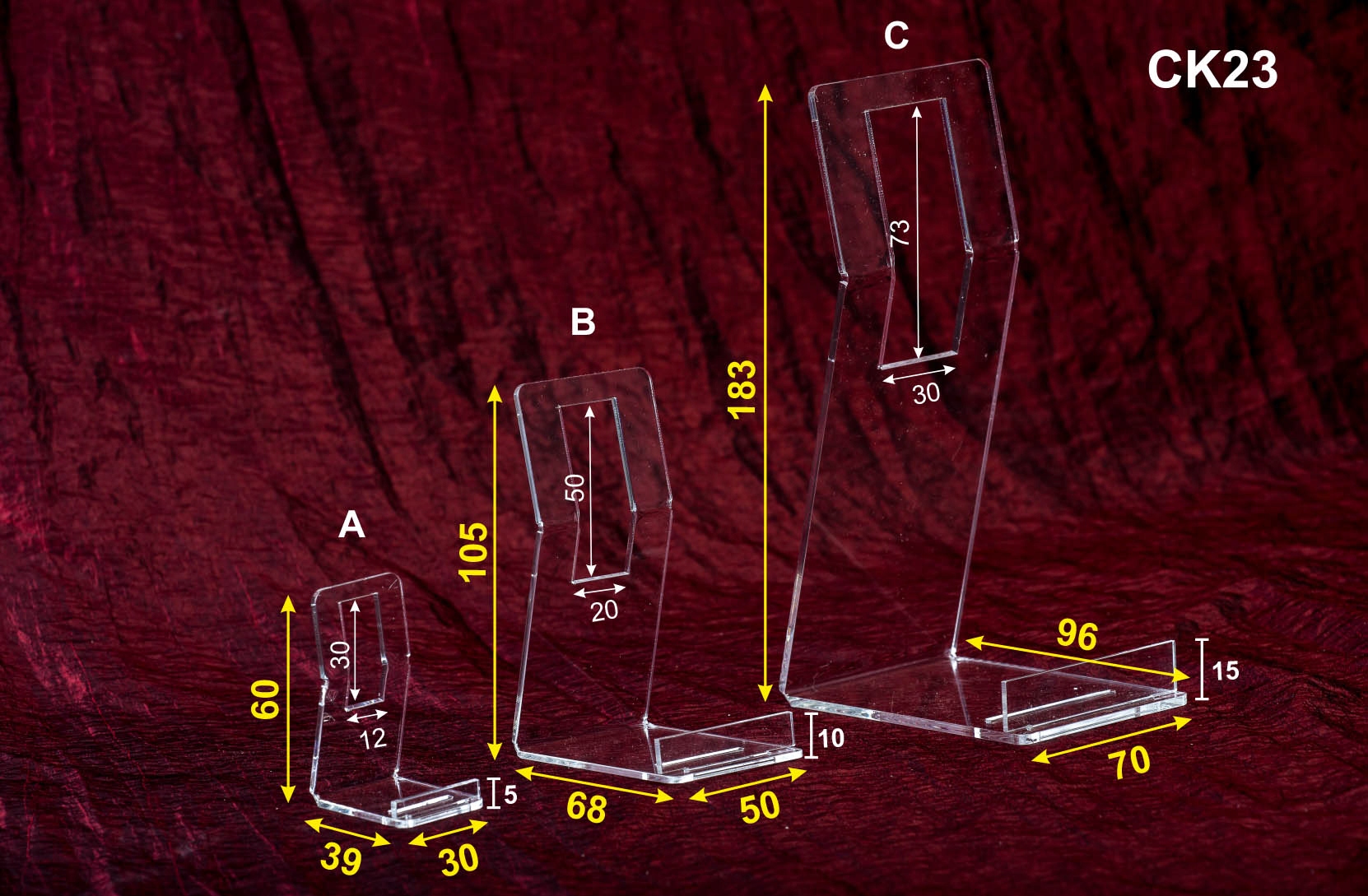 CK 23C Ідеально підходить для демонстрації різних типів великих предметів, таких як медалі, тарілки та інші сувеніри. У його нижній частині є два положення для регулювання кута нахилу спинки.