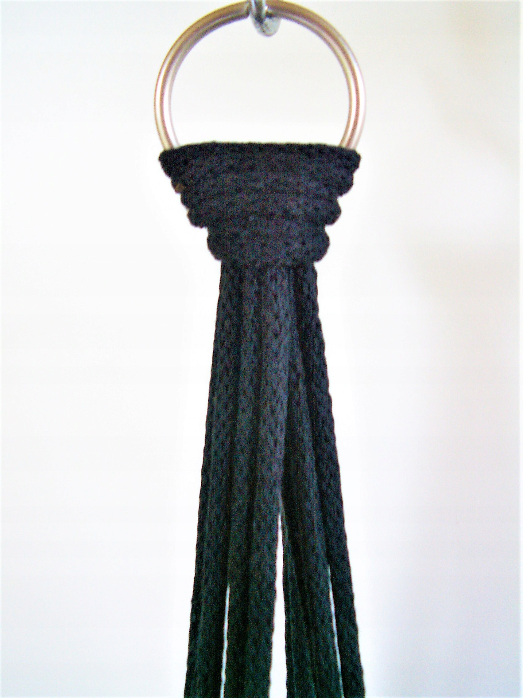 Підставка для квітів сплетена в техніці макраме з високоякісної бавовняної нитки з поліестеровим наповнювачем. Ідеально підходить для горщиків діаметром 10-15 см. Колір чорний.