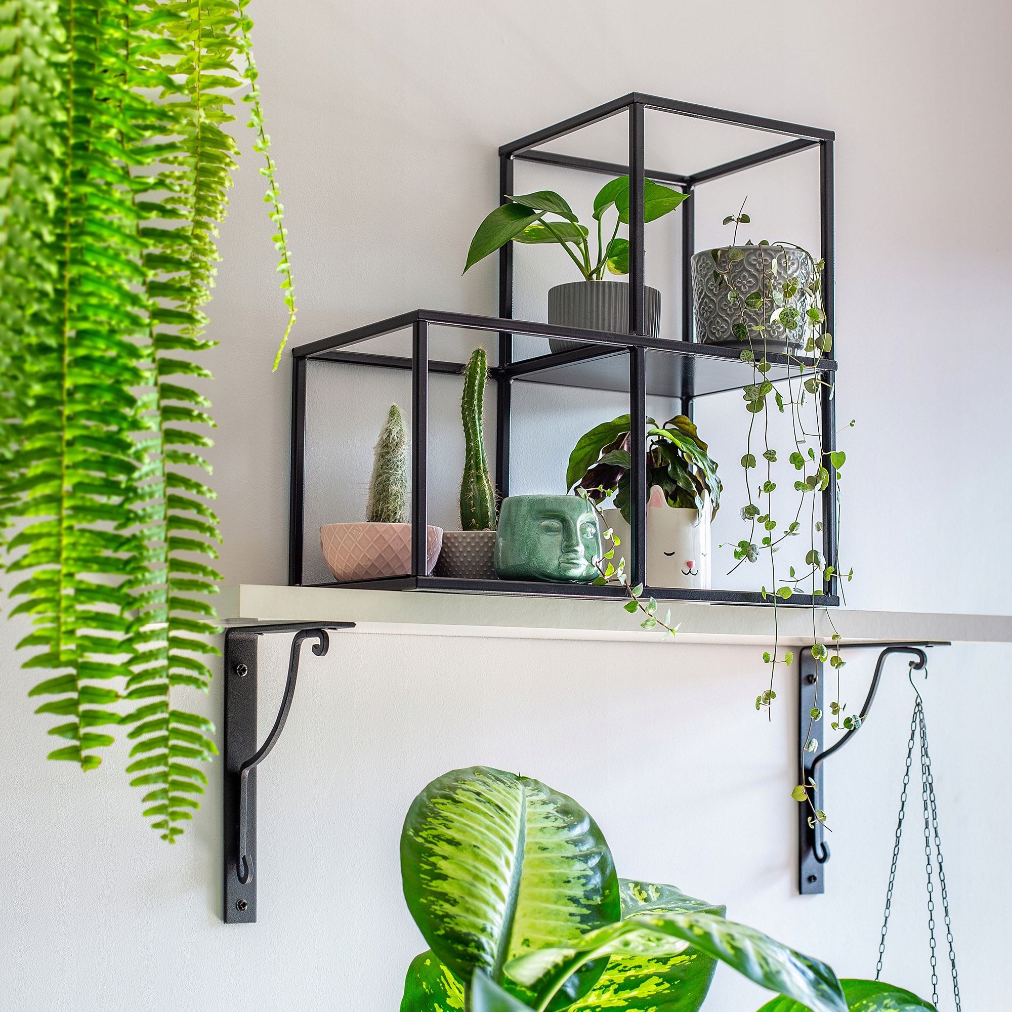 Розміри окремої полиці – 20х20 см, а загальна висота виробу – 42 см. Інсталяція ідеально вписується в останні тенденції, оскільки відноситься до геометричного дизайну. Підставки для квітів у такому варіанті допоможуть оживити навіть саму передбачувану композицію.