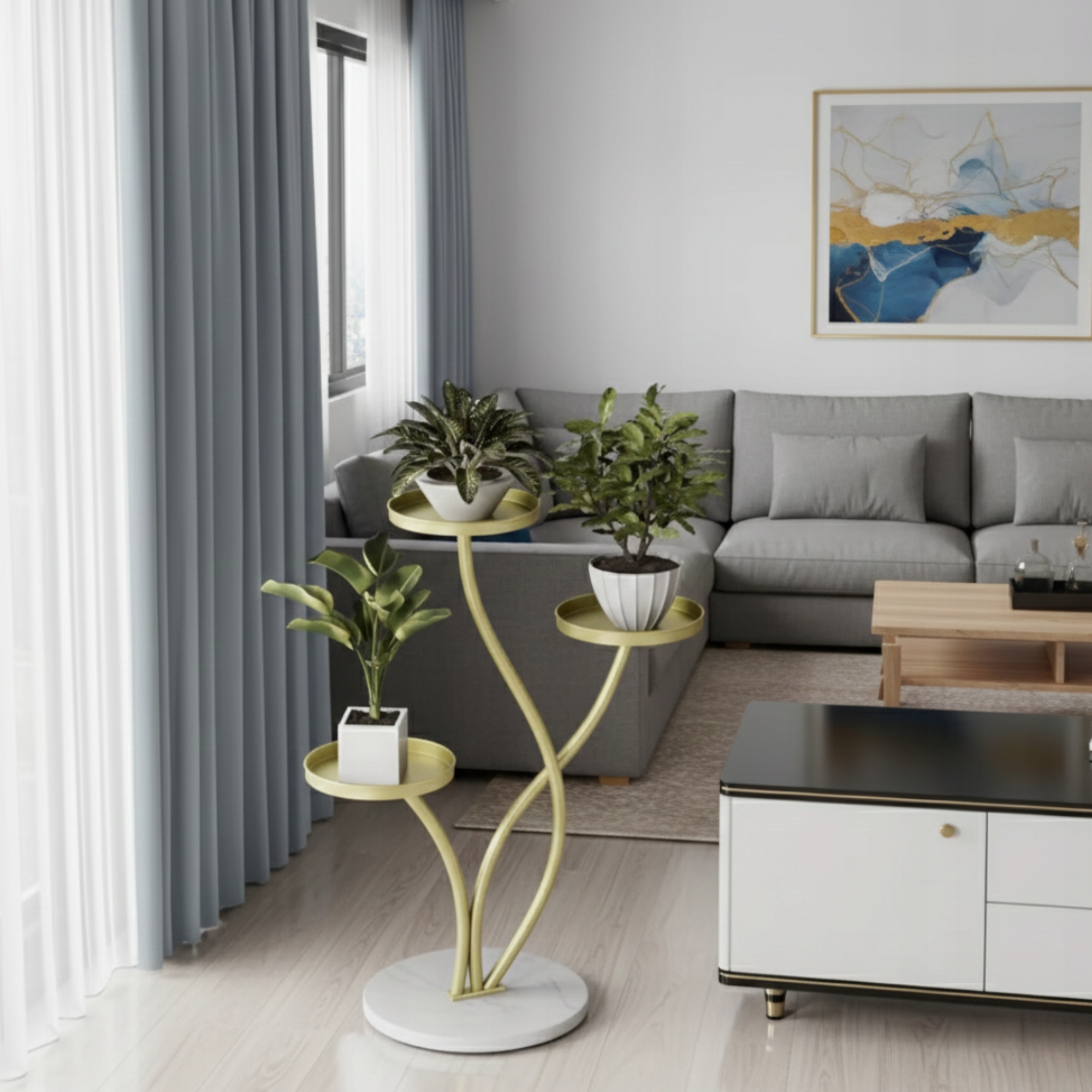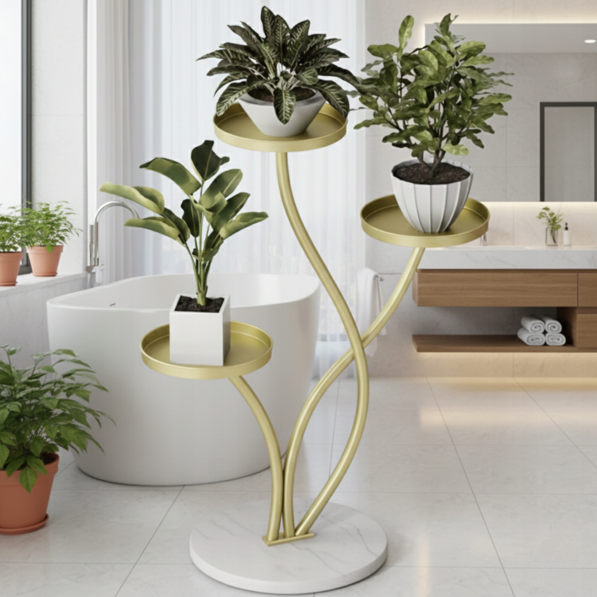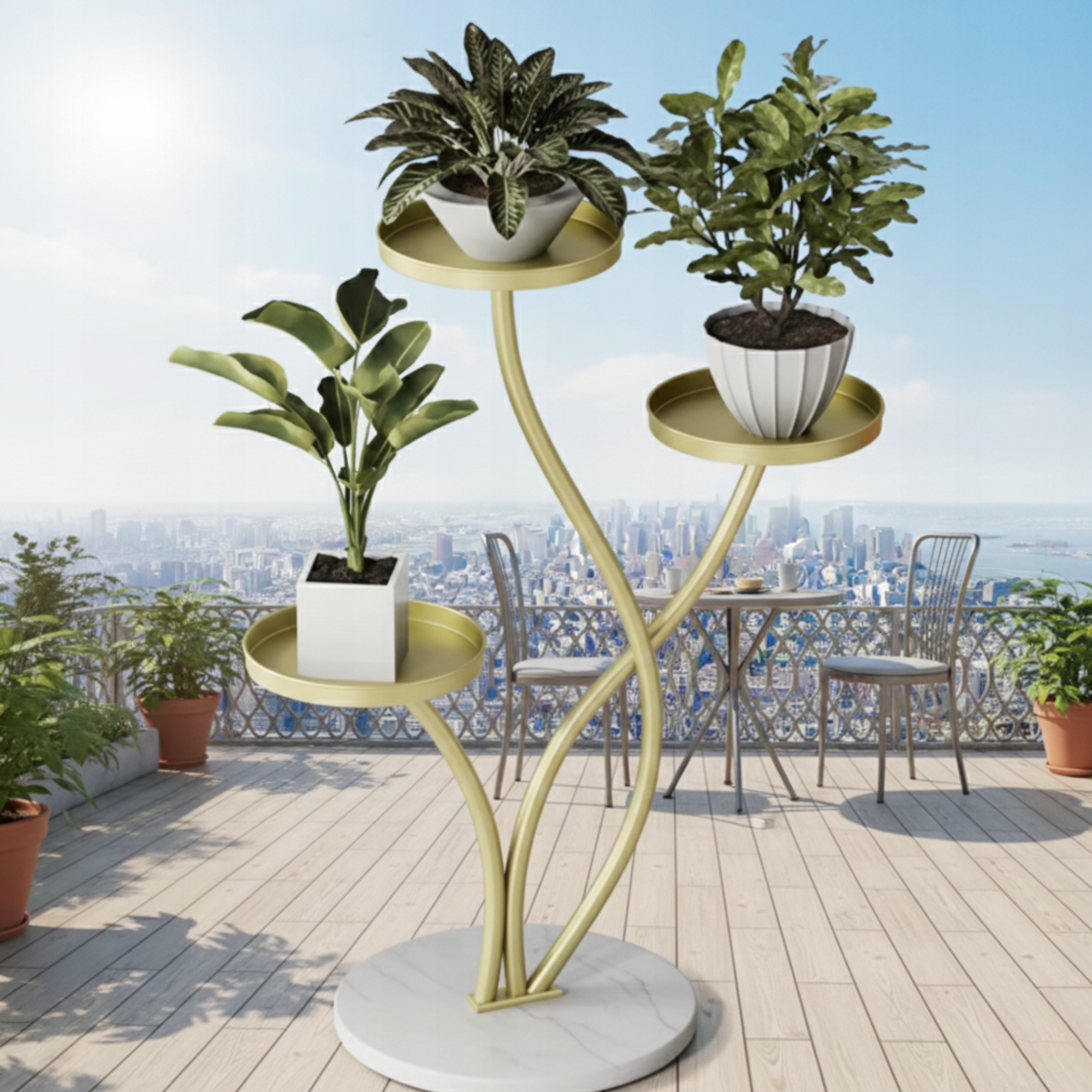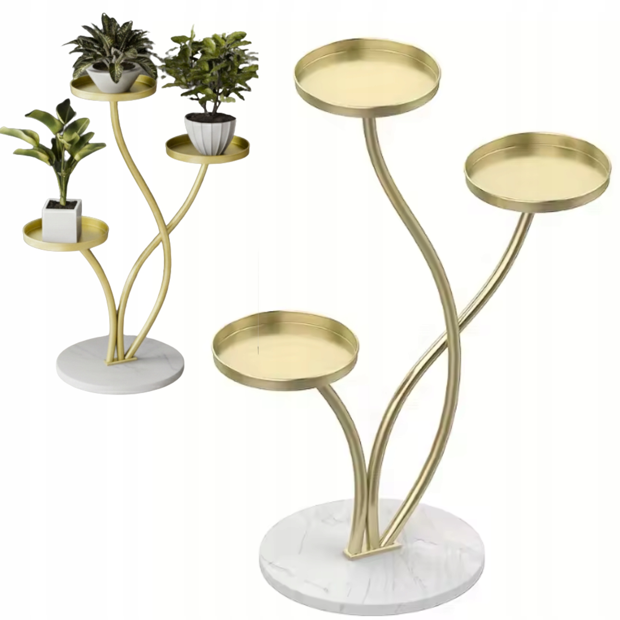 ☑️Ця стильна підставка для квітів – це поєднання елегантного дизайну та високої якості виготовлення. Конструкція була розроблена з урахуванням естетичної демонстрації 3 вазонів, зберігаючи легкість і гармонію форми. Золоте покриття чудово контрастує з кам'яною основою, надаючи всьому цьому розкішний характер. Підставка для квітів ідеально підходить як для внутрішнього, так і для зовнішнього використання. Це ідеальний вибір для людей, які хочуть поєднати декоративність із функціональністю.