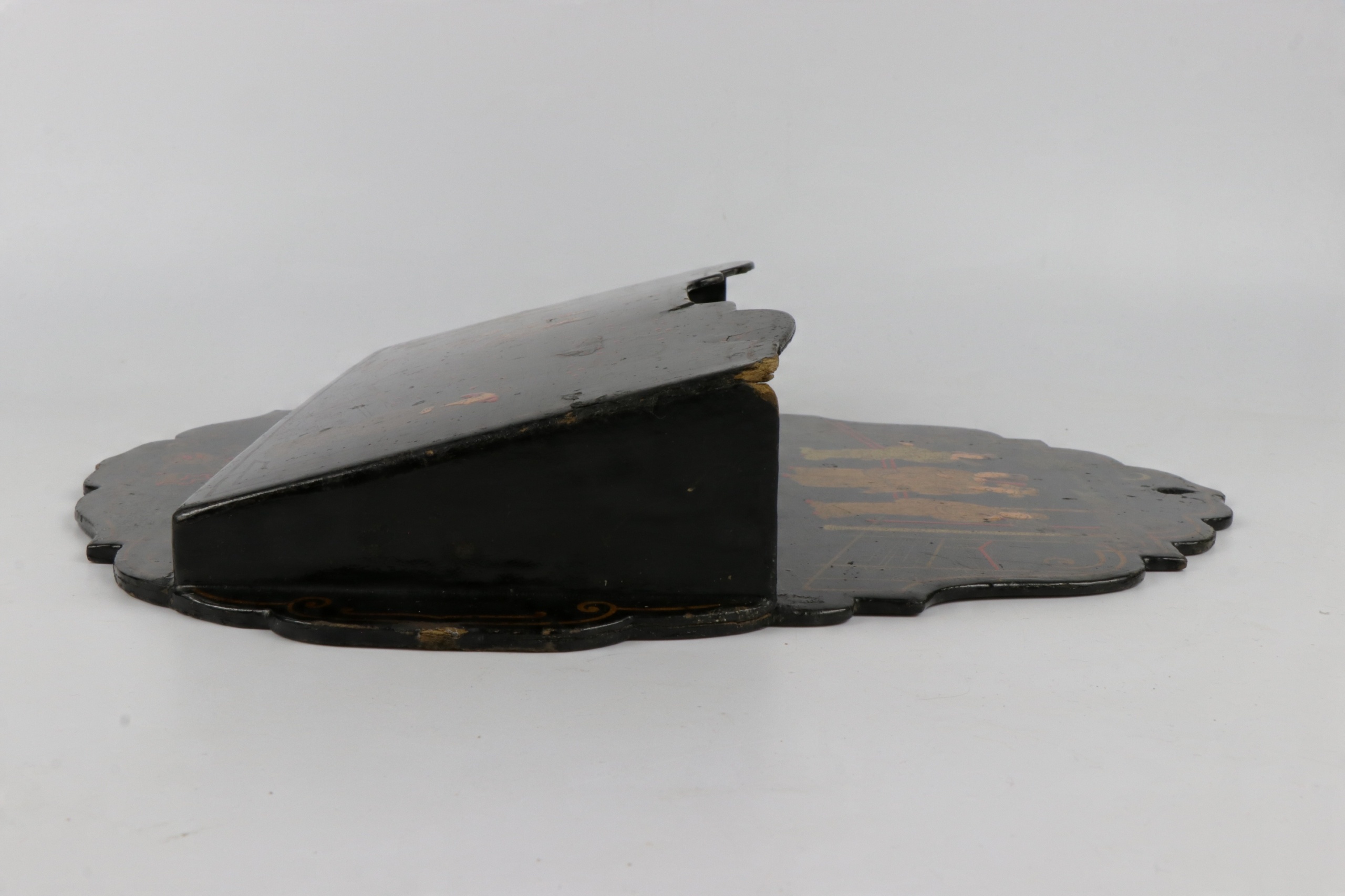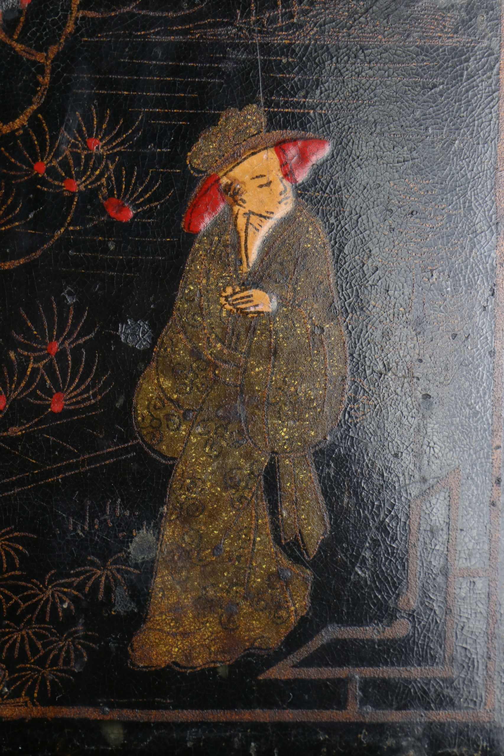 Китайська листівниця з лаку та пап'є-маше, розписана вручну жанровою сценою. Листоноша, вікторіанський період, коли речі схожого стилю були дуже популярні в Англії та Європі. Орнамент дуже точно намальований золотою фарбою. Предмет колекціонування.