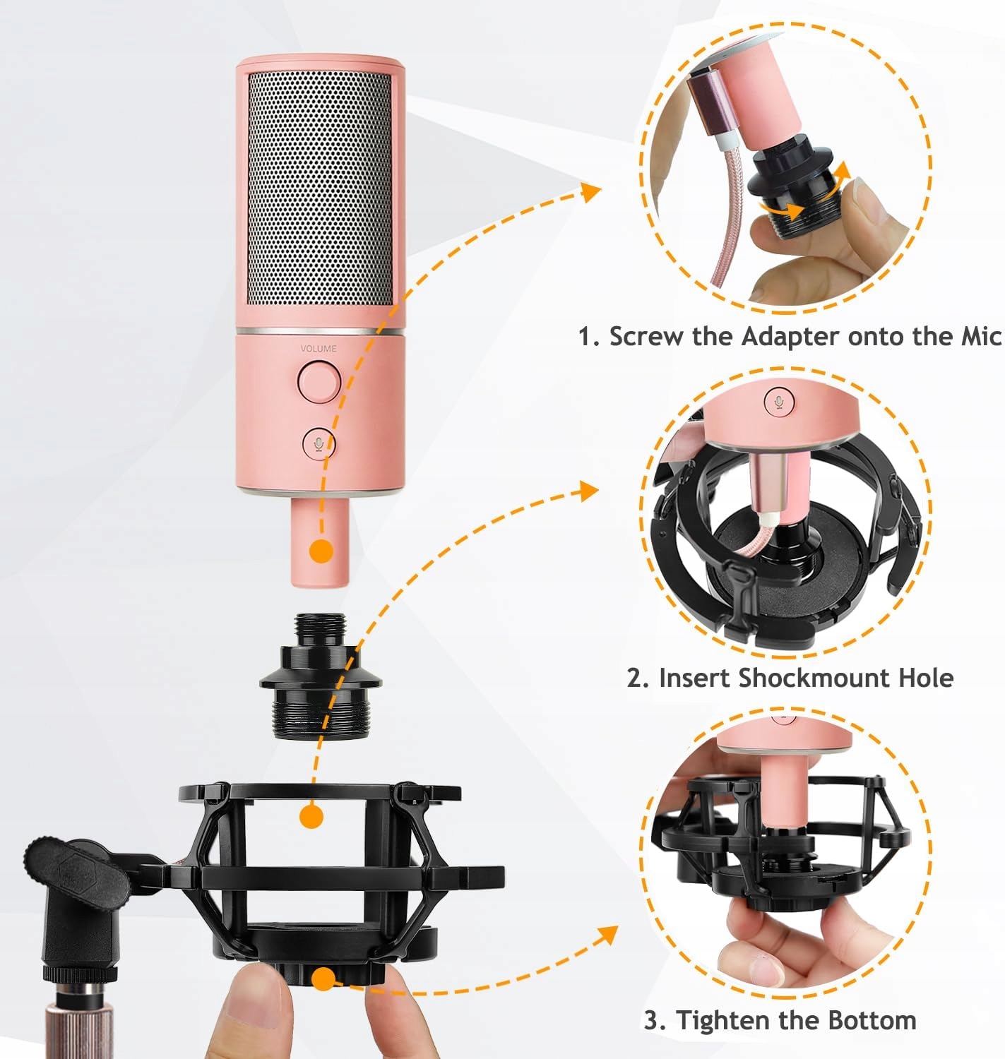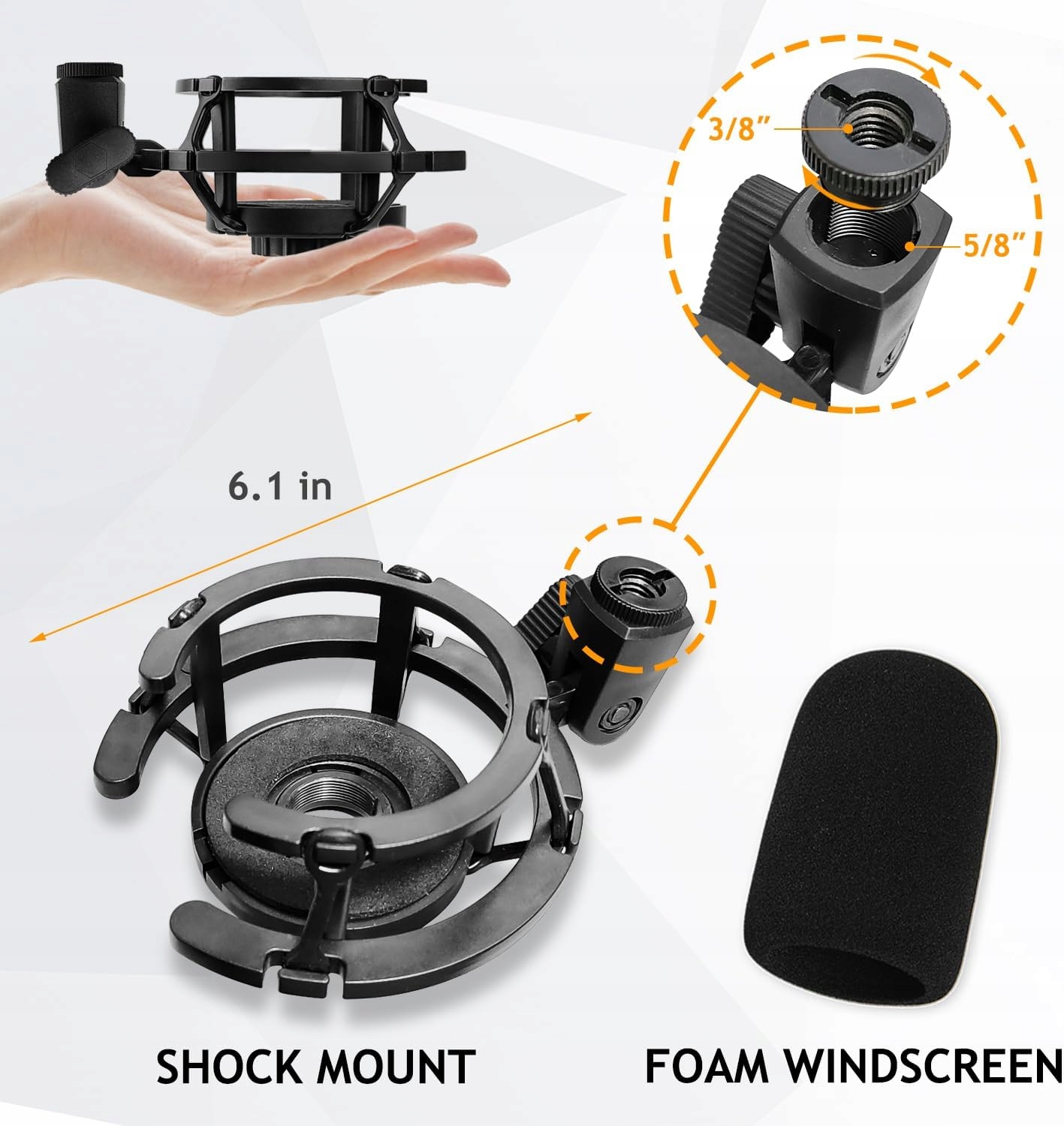 з гвинтовим адаптером 3/8 "-5/8", інтегрованим з антишоковою ручкою. Він ідеально відповідає більшості ручок рук та мікрофонів. Шок -стійкі ручки легко відкрити плоскогубці та приємну пінопласт.