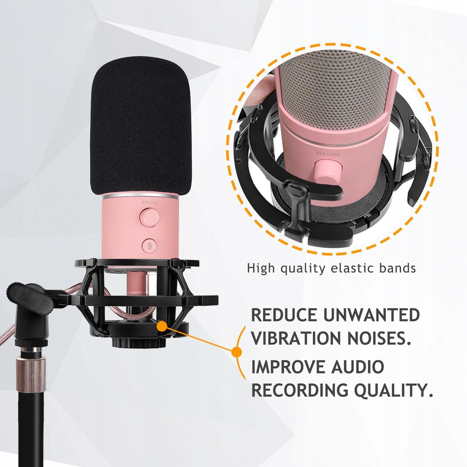 оснащений ударним стійким для зменшення вібрацій, ізолює мікрофон від шуму, ударів та вібрацій. Як і натискання на землю, натискання на стіл, регулювання стрілки тощо