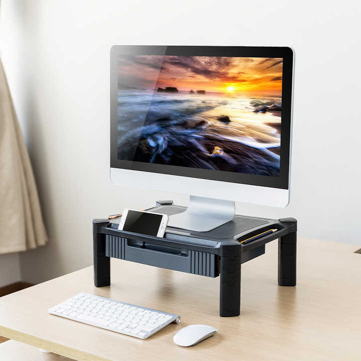 Підніміть свій монітор на ергономічну висоту та збільште простір на робочому столі за допомогою нашої регульованої підставки. Підставка має сучасний дизайн із регульованими ніжками, що дозволяє вибрати ідеальну висоту для вашого монітора. Завдяки великій відстані між ніжками підставка забезпечує достатньо місця для розміщення під нею невеликого ноутбука або канцелярського приладдя. Нековзка основа ніжок і вантажопідйомність до 10 кг забезпечують стійку підтримку монітора або інших електронних пристроїв під час роботи. Вбудований органайзер для кабелів і висувний ящик збільшують простір на столі та мінімізують безлад.