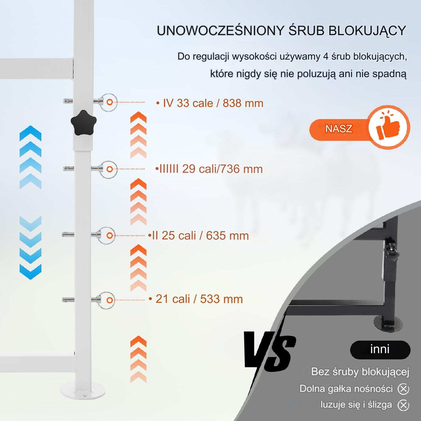 Завдяки унікальному дизайну шпильок, наша підставка для кіз пропонує чотири налаштування висоти в діапазоні від 533 до 838 мм, що дозволяє розмістити тварин різного розміру. Посилені стійки з трикутною рамою забезпечують додаткову стійкість і підтримку, підвищуючи безпеку.