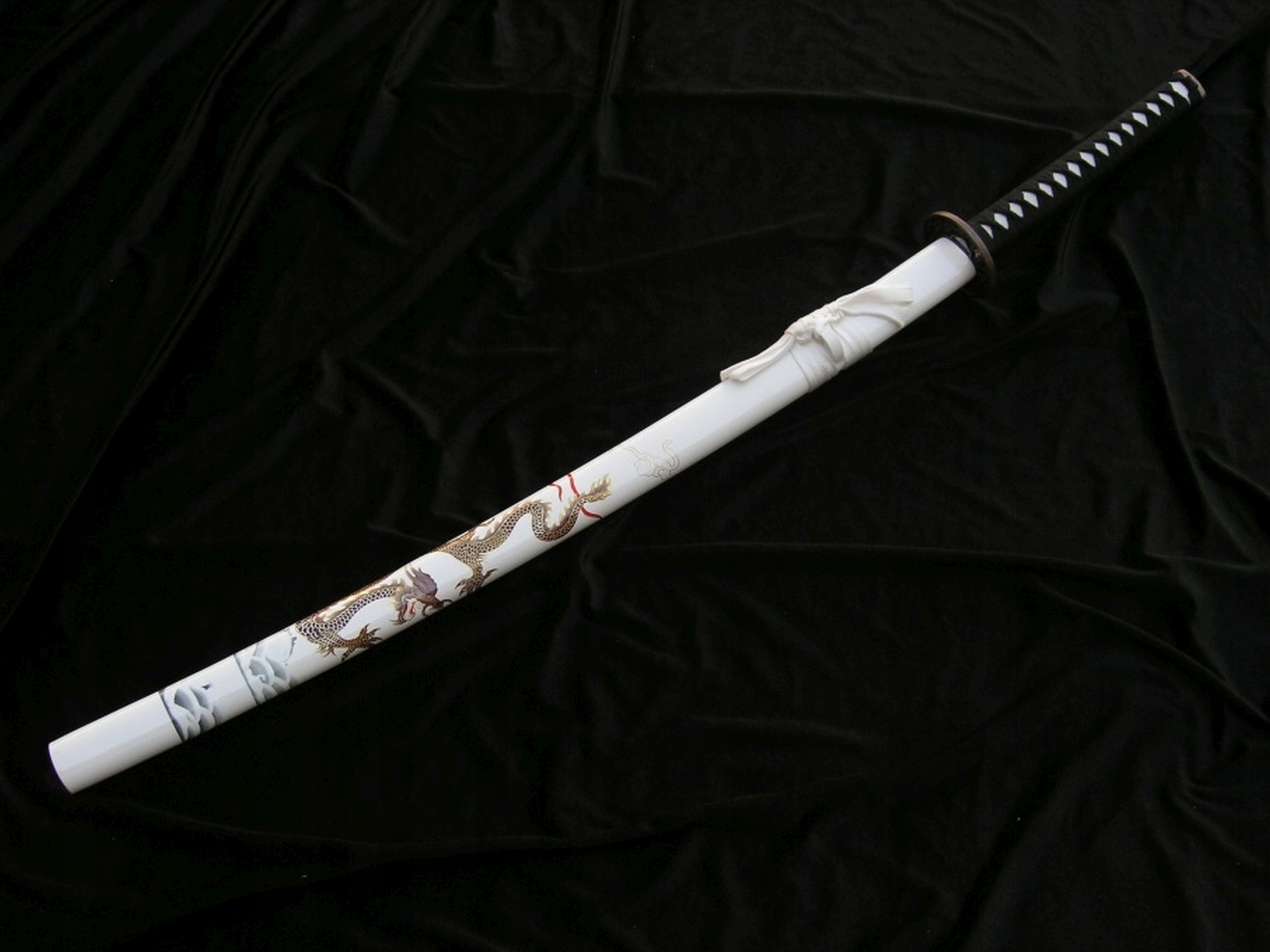 ❇️Кожен елемент цієї катани був виготовлений з надзвичайною увагою до деталей. Лезо з високоякісної вуглецевої сталі було відполіровано вручну, а характерний хамон надає йому автентичного вигляду. Дерев'яні піхви прикрашені мотивом дракона, що символізує силу та мудрість. Ручка загорнута в бавовняну тасьму з імітацією шкіри ската, захованою під нею. Цуба та кашира, виготовлені зі сплаву цинку та алюмінію, додають мечу елегантності та характеру. Таке поєднання традиційної техніки з сучасними матеріалами робить катану не тільки красивою, але й довговічної.