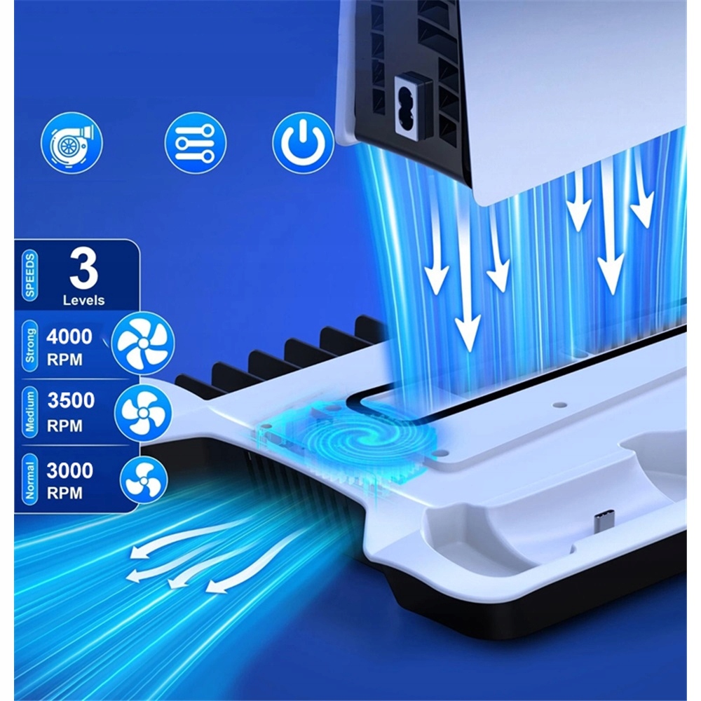 🆒【Ультратонка підставка для PS5 із турбовентилятором】Вентилятор PS5 має 3 швидкості регулювання: високу/середню/нормальну. Цей аксесуар для PS5 має великий 2,36-дюймовий турбовентилятор, який забирає гаряче повітря з-під консолі та ефективно розсіює тепло з боків, зберігаючи вашу PS5 прохолодною та тихою для кращого ігрового досвіду. Більше не турбуйтеся про перегрів під час тривалих ігрових сесій! Станція охолодження PS5 збільшує термін служби консолі.