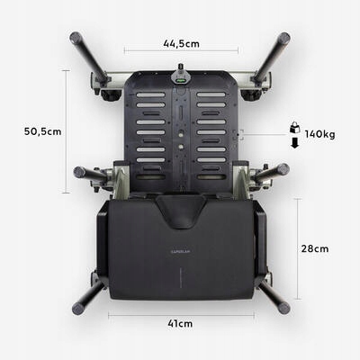 - платформа 50 см в розкладеному стані забезпечує комфорт для ніг і стоп; - Бічну платформу 42 см можна розмістити з правого або лівого боку між двома бічними ніжками; - Бічна платформа оснащена засувкою на шасі для фіксації в складеному або розкладеному положенні. Передній коннектор призначений для кріплення коляски, також його можна використовувати як тримач сітки.