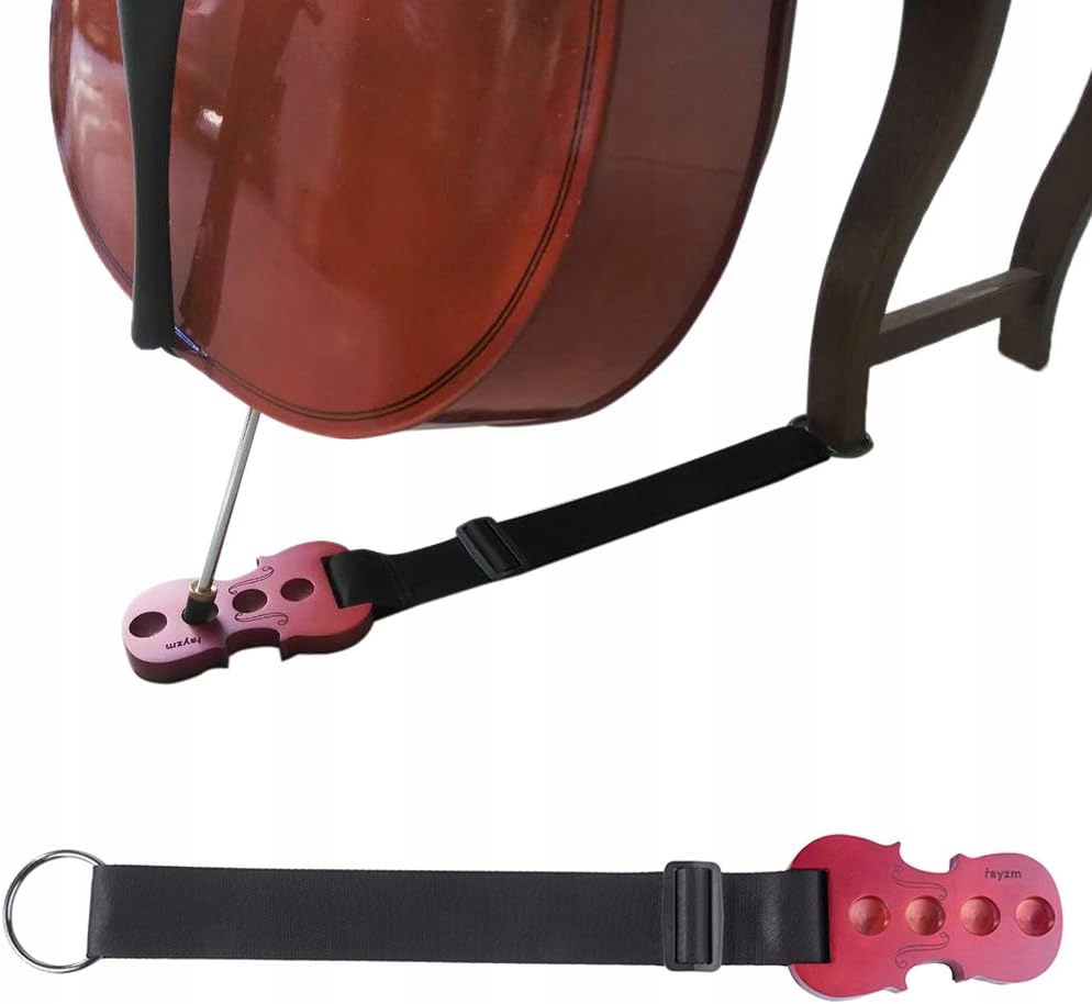 - Нейлоновий ремінь шириною 5 см можна регулювати по довжині від 38 см до 69 см для більшості віолончелей завдяки міцній застібці з ABS-пластику. До ніжки стільця, на якому сидить віолончеліст, прикріплено металеве кільце діаметром 6 см.
