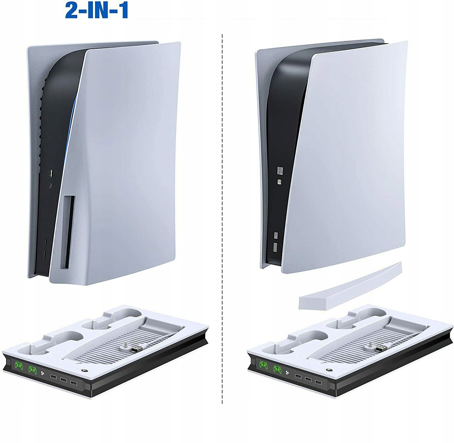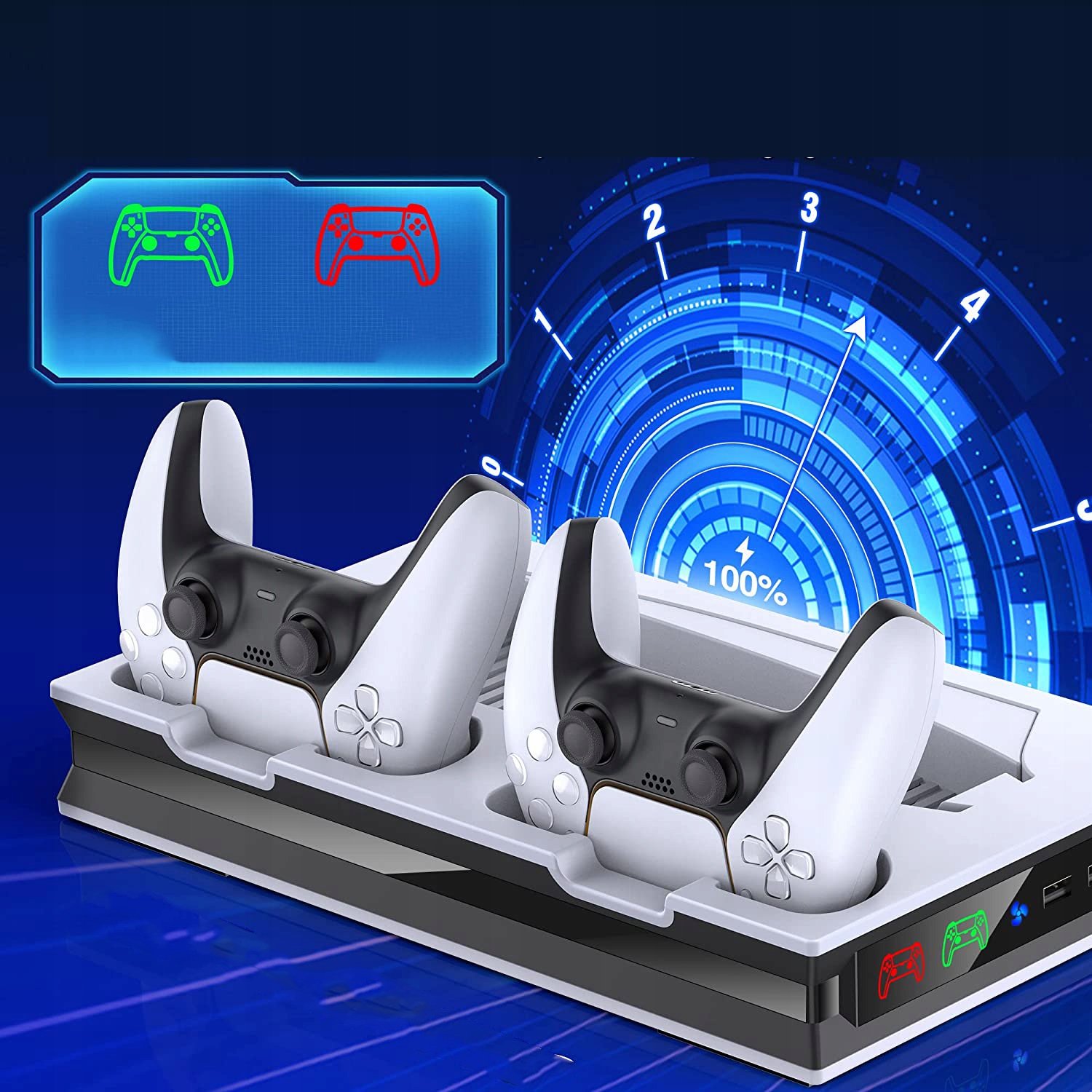 підставка для цифрової/дискової версії PS5 із зарядною станцією Dualsense,підтримує цифрову версію Консоль Playstation 5 і дискова версія PS5 мають два тихих і потужних вентилятори 20 дБ, які допомагають розсіювати тепло консолі PS5 і запобігають її перегріву після тривалих ігрових сесій. (Функція вентилятора може керуватися кнопкою, просто натисніть, щоб вимкнути функцію вентилятора)