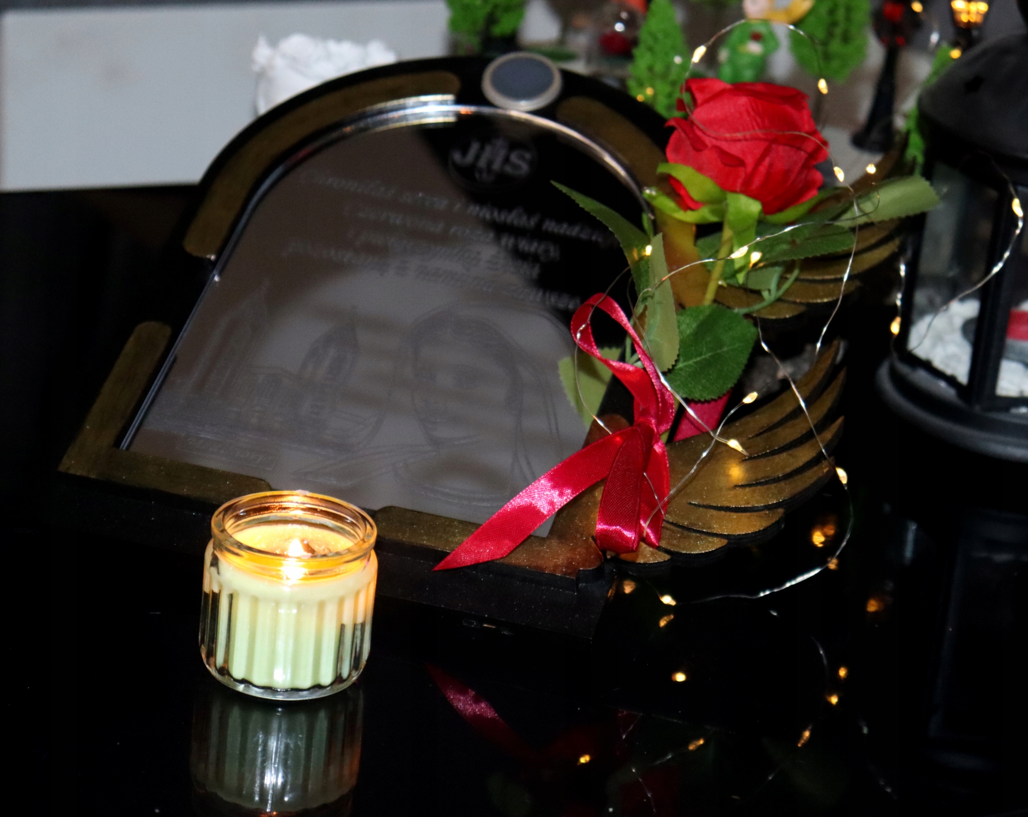 Елегантна композиція для могили - підставка з гравіюванням, дзеркалом з оргскла, трояндою та сонячними вогниками