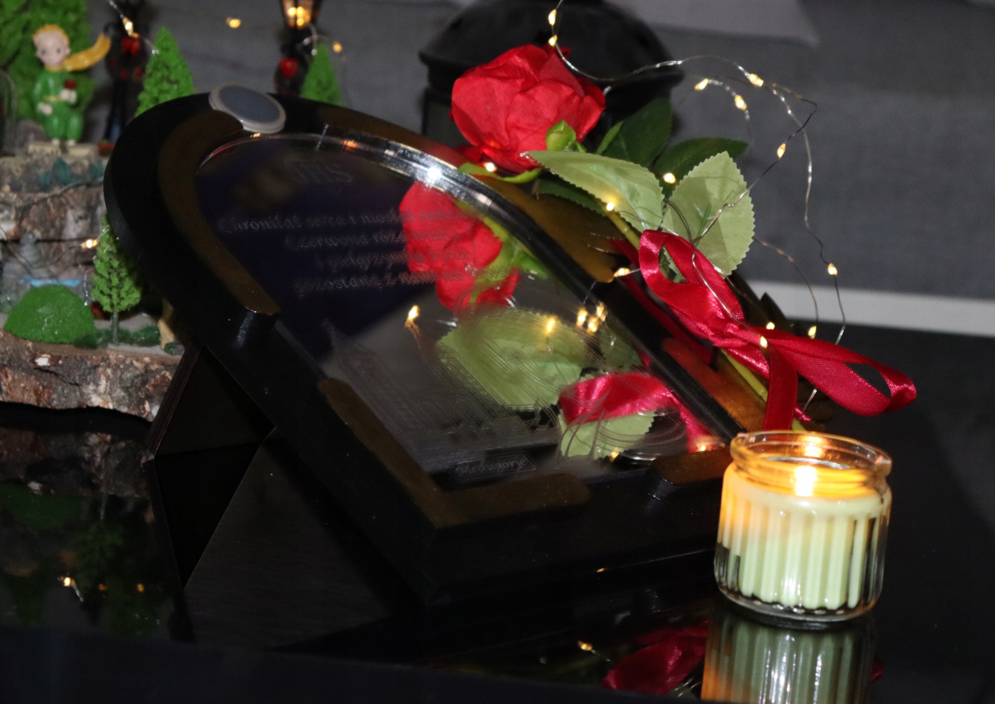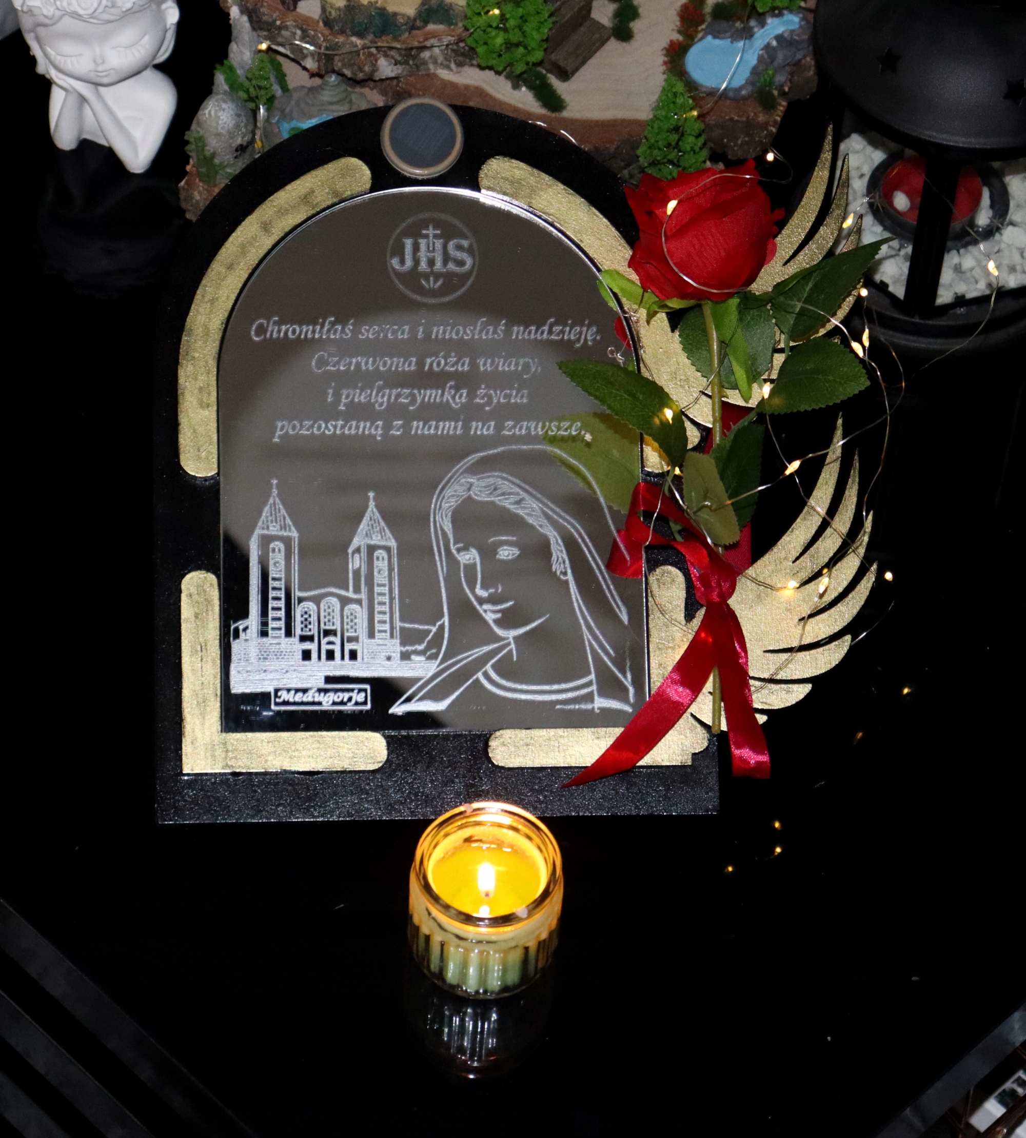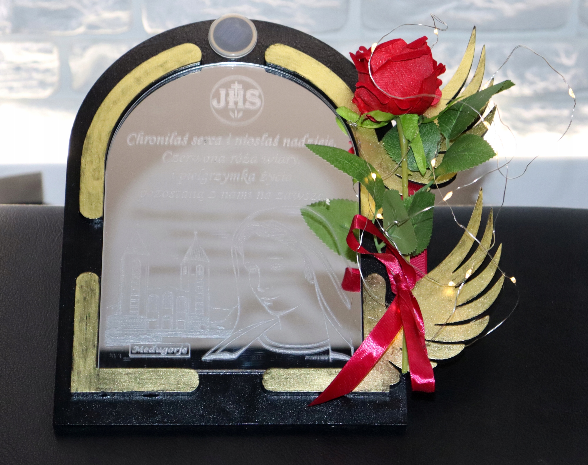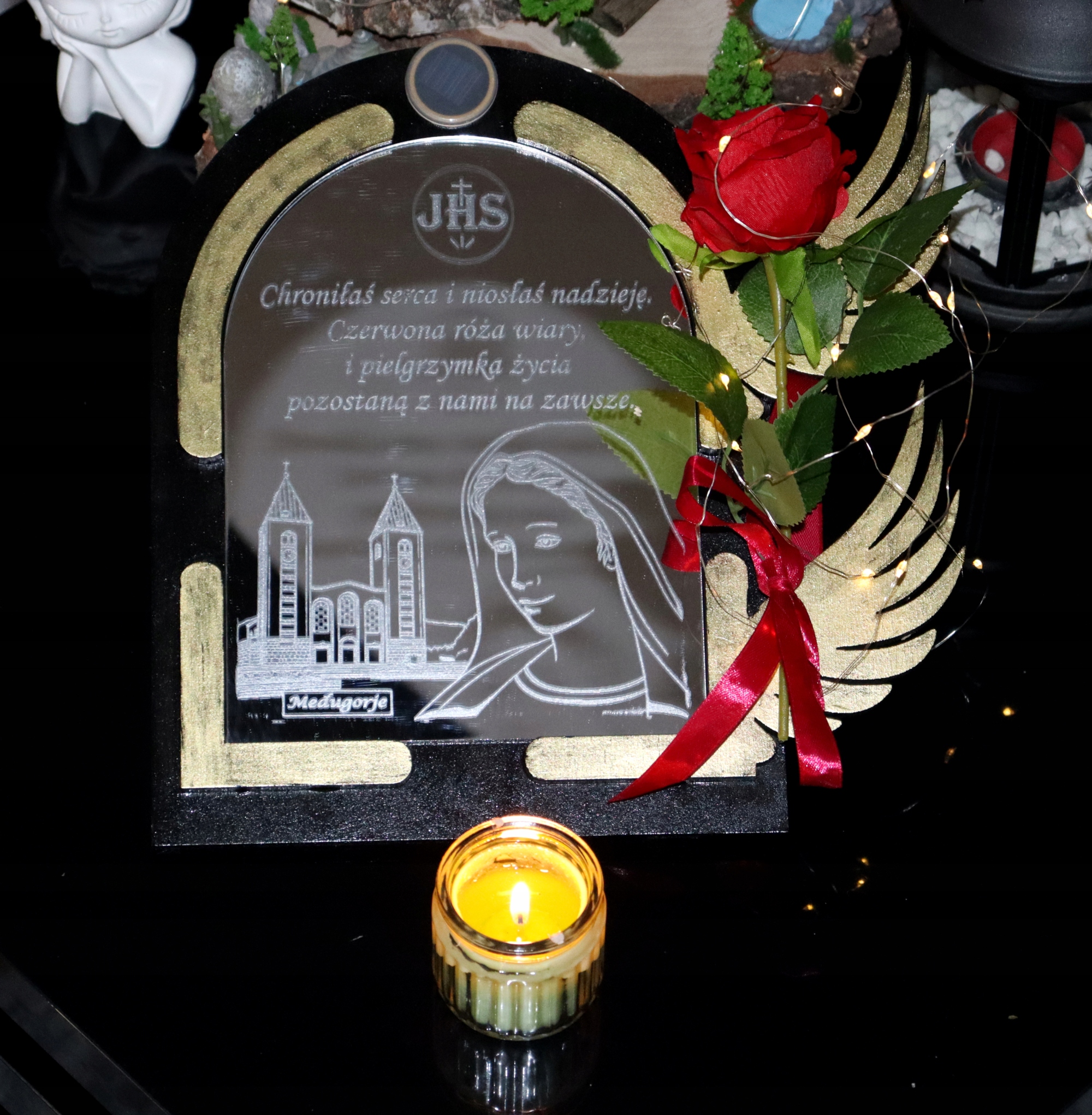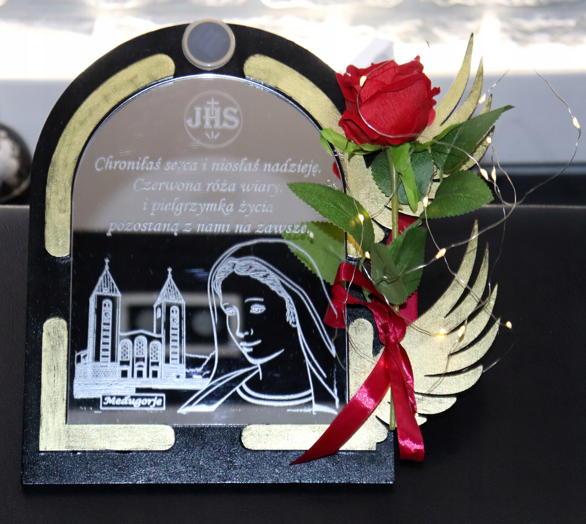Прикрасу доповнює реалістична червона троянда з бантом, яка надає цілісності унікальний персонаж. Основа має вбудовану сонячну панель, яка живить дротяні світильники. Це ідеальний сувенір, який ідеально підійде як вираження пам’яті та поваги до близької людини.
