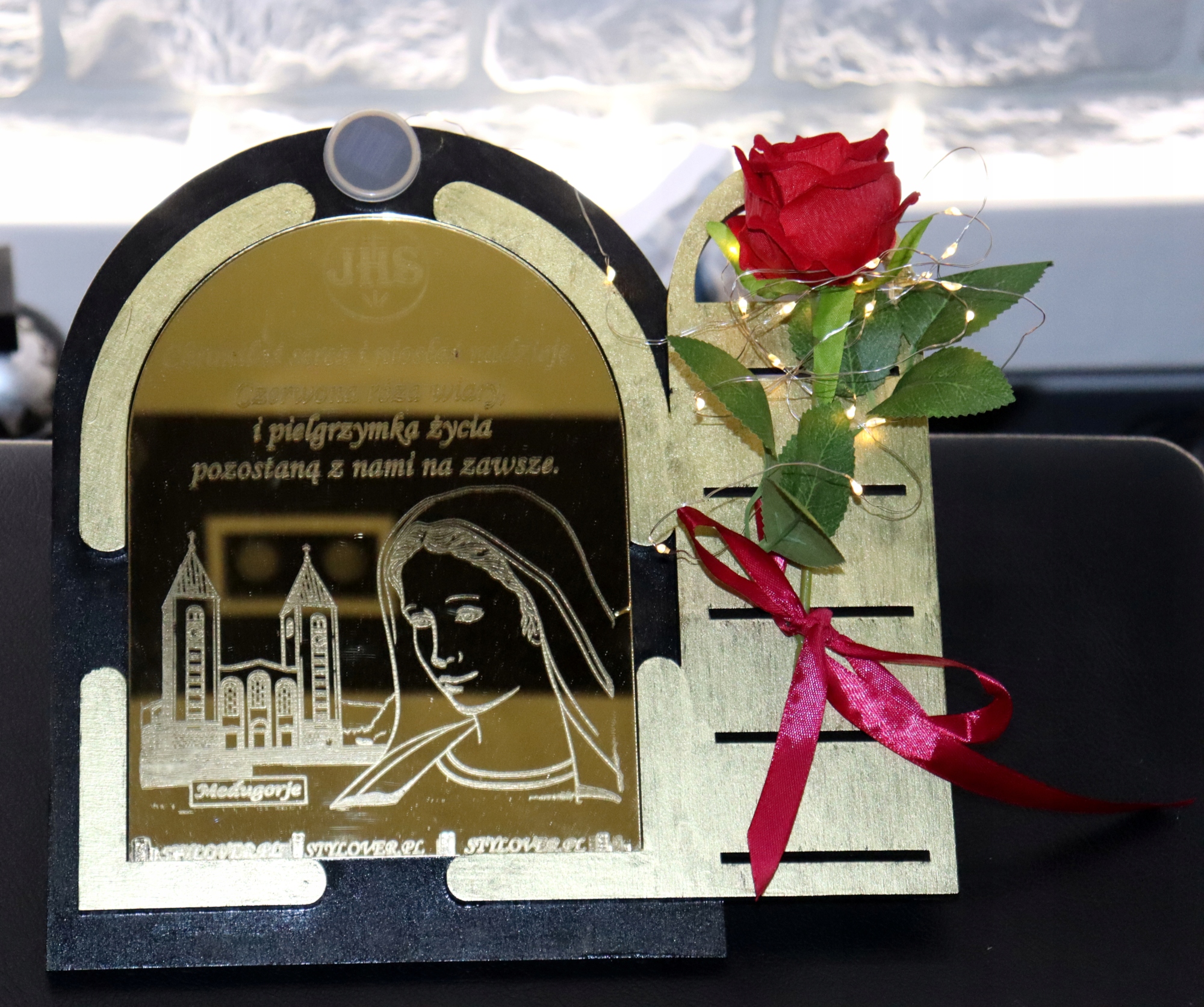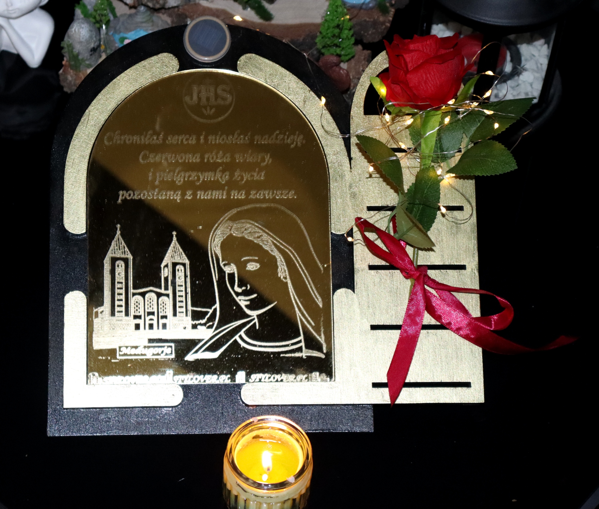Прикрасу доповнює реалістична червона троянда з бантом, що надає всьому неповторного характеру. Крім того, в основу вбудована сонячна панель, яка живить світло на проводах. Це ідеальний сувенір, який чудово підійде як вираження пам'яті та поваги до близької людини.