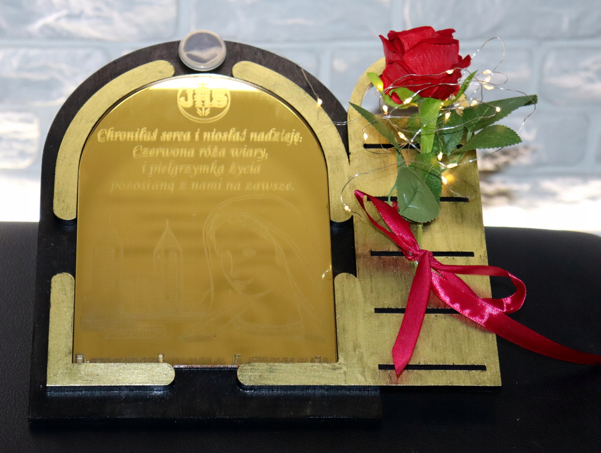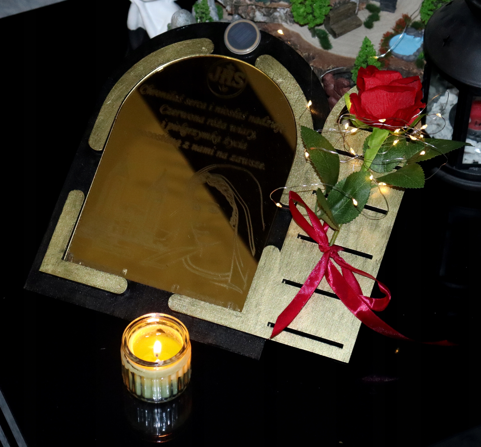 Ми представляємо унікальну прикрасу надгробка, яка поєднує в собі елегантність і довговічність. Композиція виготовлена з високоякісної фанери, пофарбованої в золотий і чорний колір, що надає їй класичний і стриманий вигляд. У центральній частині розташовано дзеркало з оргскла, прикрашене точним гравіюванням - ідеальне для персоналізації або містить символічне повідомлення.