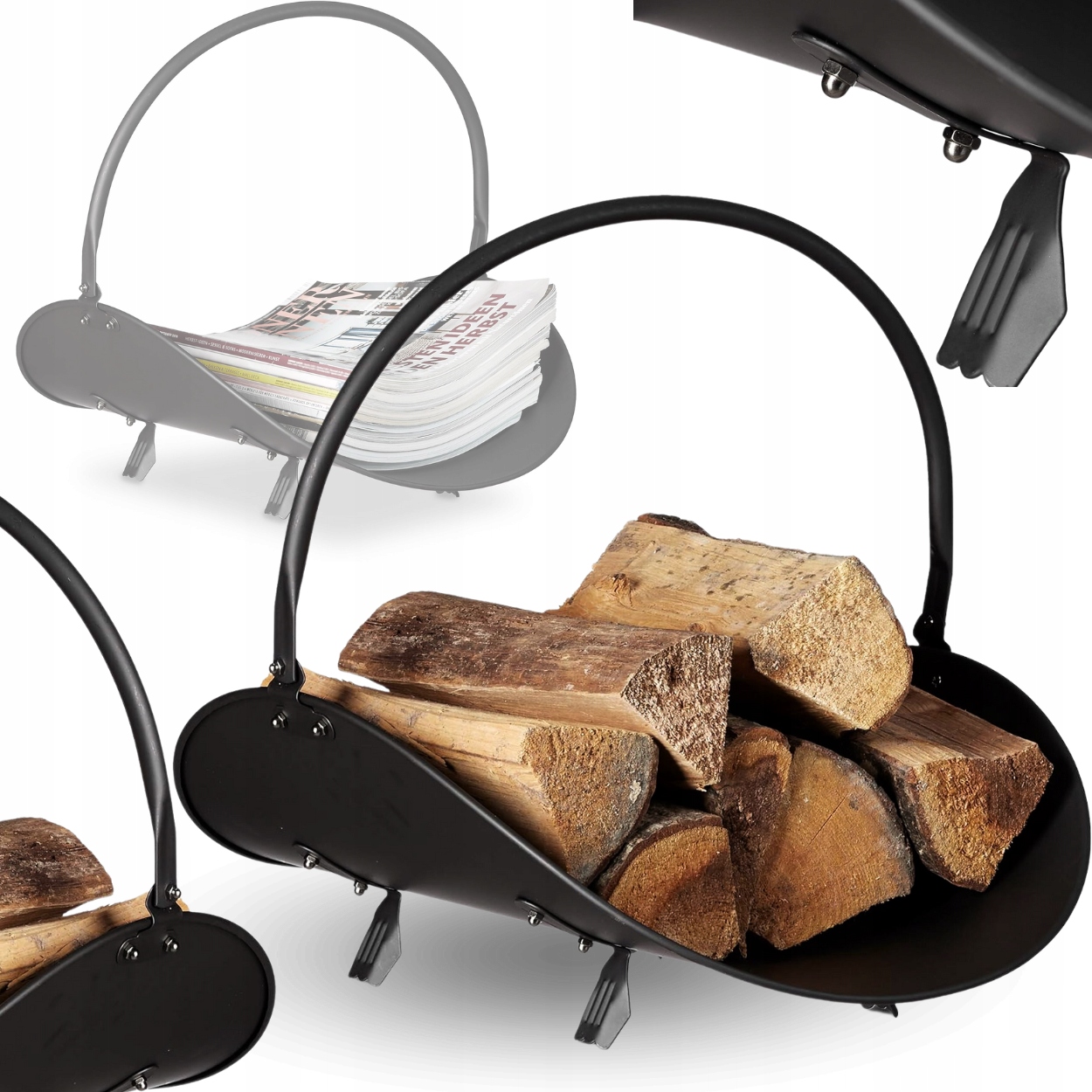 Цей чорний кошик для дров виготовлений із міцної сталі, що забезпечує довговічність і стабільність.