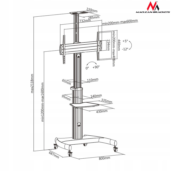 - Сумісність зі стандартом VESA: 200x200, 300x200, 300x300, 400x200, 400x300, 400x400, 600x400 Регулювання висоти: від 1200 мм до 1600 мм