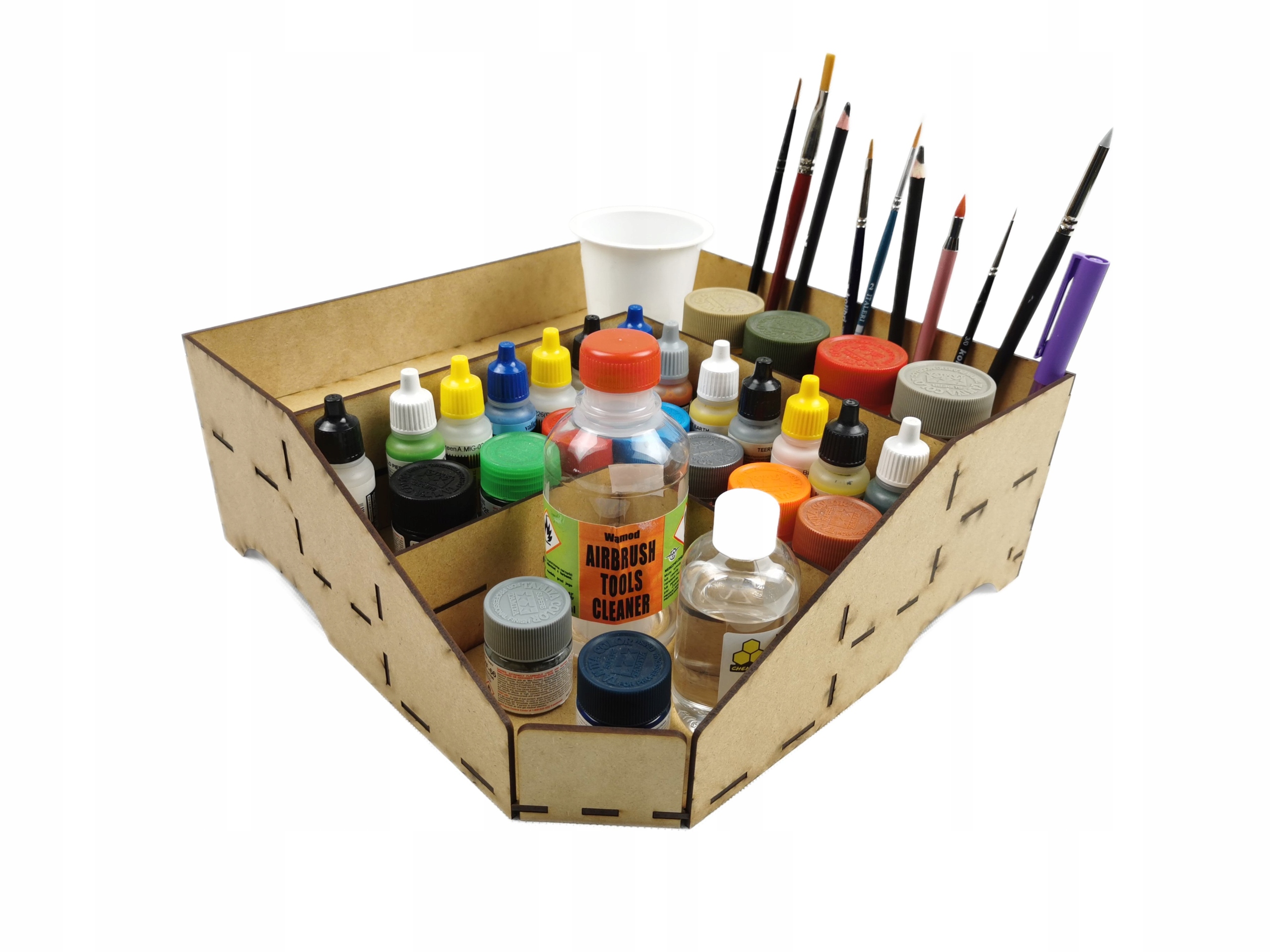 Він був розроблений для забезпечення відповідної глибини отворів, завдяки чому пензлі чи олівці міцно стоять і не хитаються. Відділення ідеально підходять для фарб, хімікатів для моделювання та всіх необхідних інструментів.