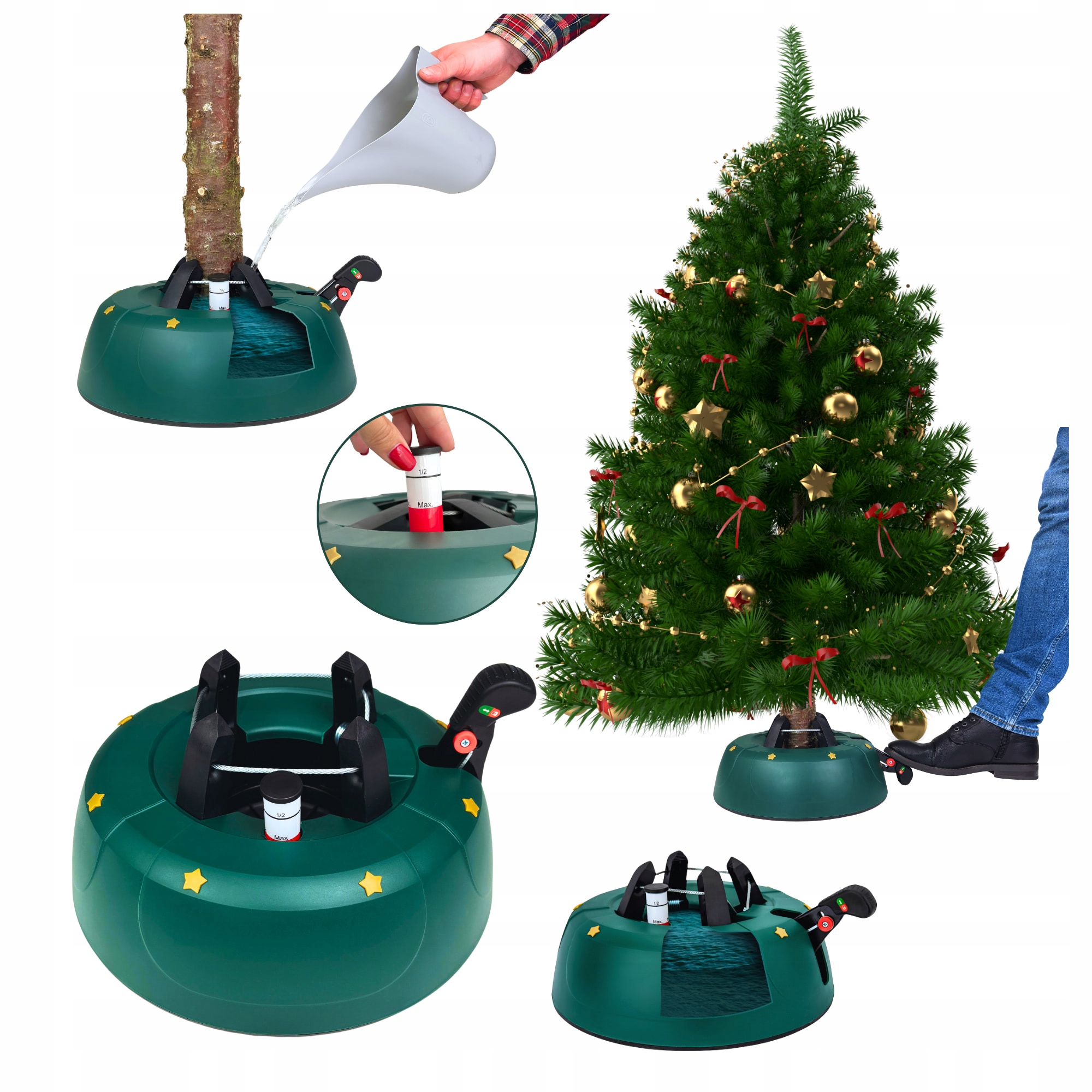Підставка під ялинку Kamai® START 2.0, призначена для новорічних ялинок висотою до 2 метрів, забезпечує стійкість завдяки навантаженню 4,2 кг, ємності для 2 літрів води та запатентованій системі. 4 гачки, які автоматично затискають стовбур. Він оснащений індикатором рівня води, важільним замком для запобігання випадковому відкриванню та надійним затискним механізмом.