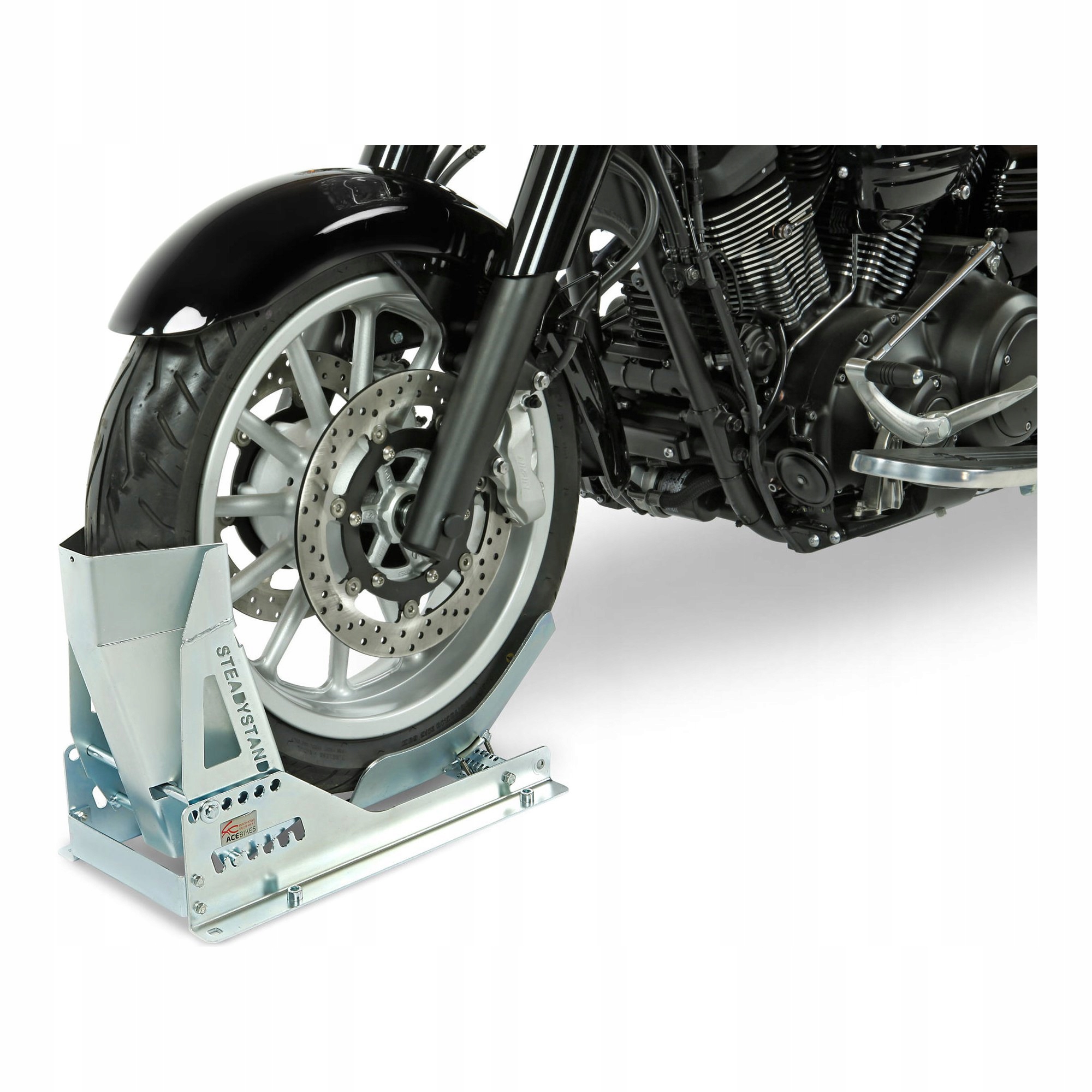 Стійка для мотоцикла з стійкою стійкою забезпечує найвищу безпеку завдяки чудовій якості та точному виготовленню. Просто вставте мотоцикл у підставку, щоб забезпечити його стабільна опора в мить ока. Завдяки цьому технічне обслуговування або тривале паркування не є проблемою. Мотоцикл не займає багато місця, незалежно від того, чи стоїть він у гаражі, на задньому сидінні транспортера чи на причеп.