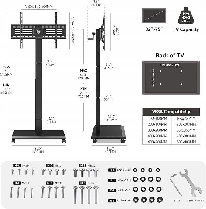 - Сумісність: телевізійний візок на колесах підходить для телевізорів, комп'ютерних моніторів з діагоналлю екрана 32-75" до 40 кг. Сумісний з отворами VESA: 100 x 100/200 x 200/300 x 200/300 x 300/400 x 200 x 400 x 300 см /400 х 400/600 х 400. Перед покупкою просимо уважно перевірте розмір, вагу та VESA вашого телевізора