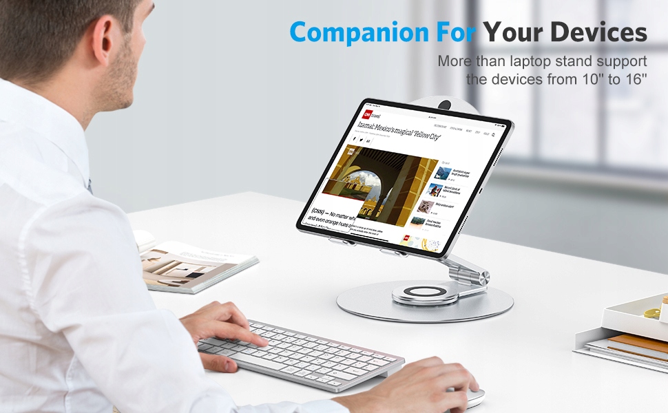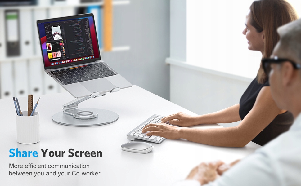 РУБІЛЬНА ТА ЕРГОНОМІЧНА: ця підставка для ноутбука, яка обертається на 360° і з’єднується з основою, дає змогу повертати ноутбук під будь-яким кутом. Піднімає ноутбук до рівня очей, щоб покращити поставу та зменшити жорсткість шиї та спини.
