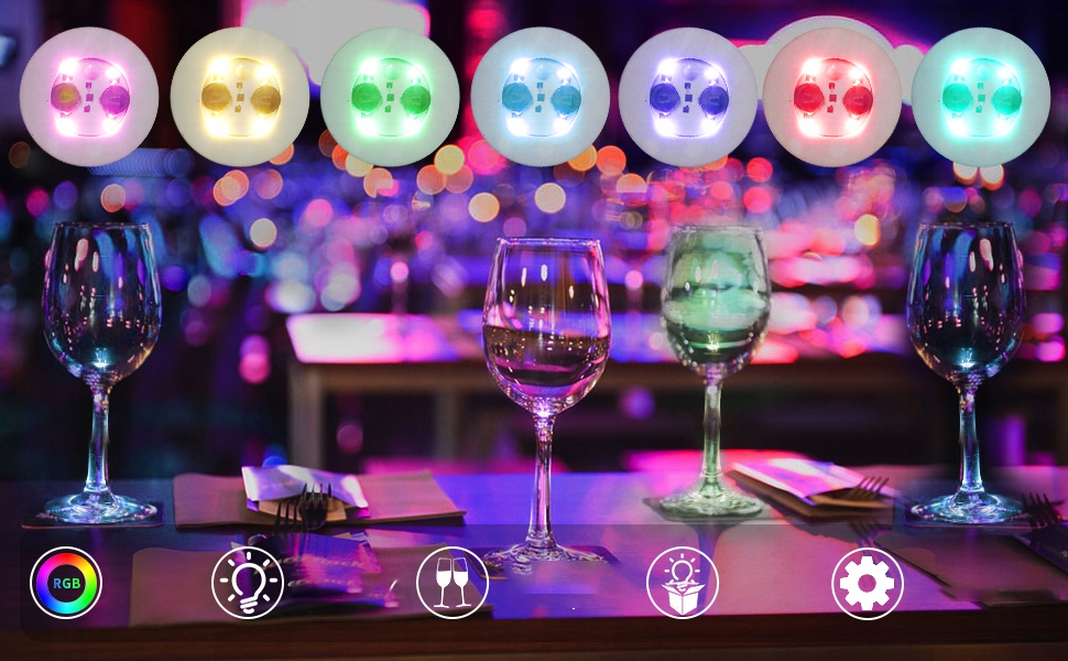 Підстаканники зі світлодіодним підсвічуванням доступні в 7 кольорах і 2 змішаних режимах миготіння. Вони є ідеальними легкими прикрасами та можуть використовуватися в барах, домашніх барах, полицях з алкогольними напоями, весільних центрах, на різноманітних вечірках, у скляних, вазових, пляшкових та вечірках із диск-гольфом.