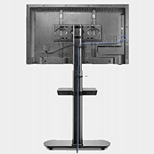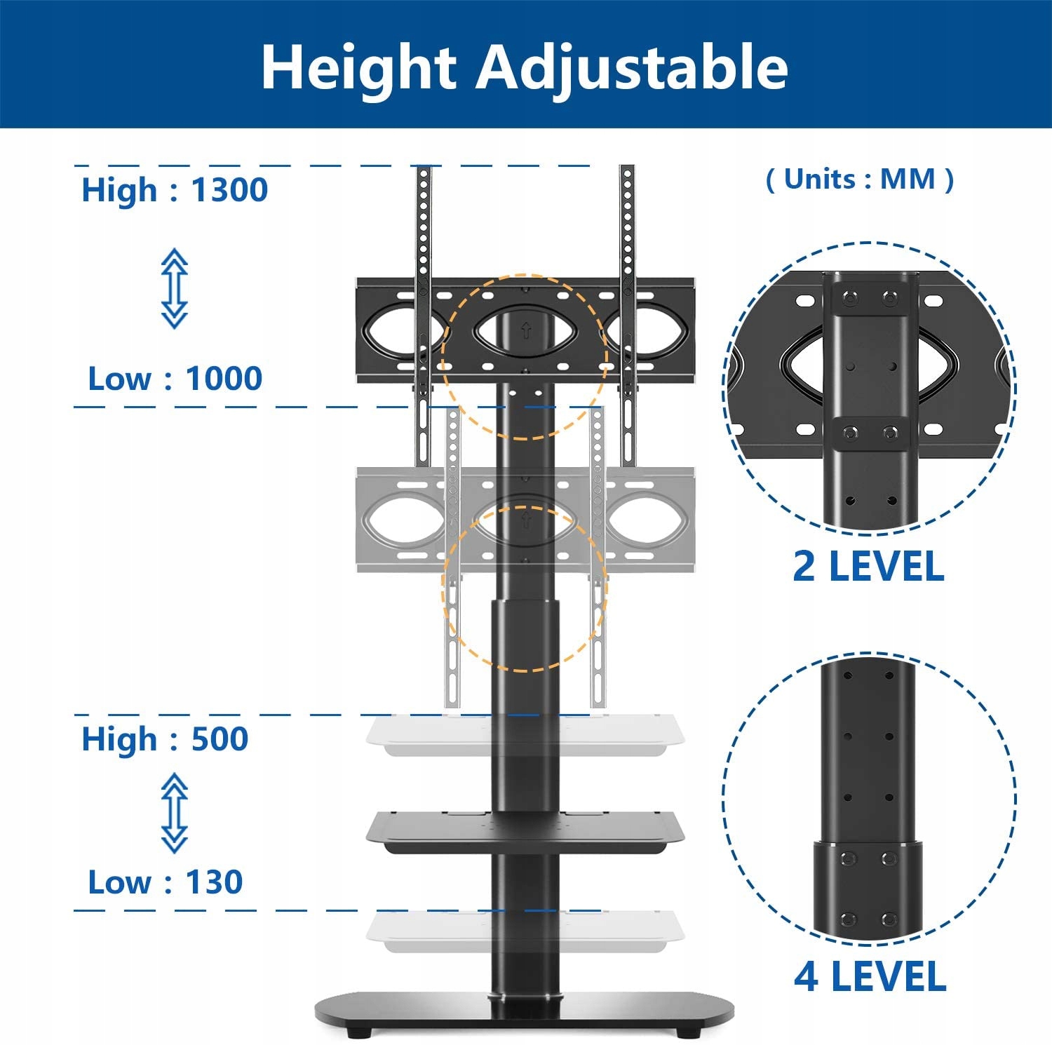 - Сумісність з телевізором: універсальна підлогова підставка для телевізора підходить для телевізорів від 32 до 60 дюймів з максимальним навантаженням 35 кг. Сумісність з VESA: від 100x100 мм до 400x400 мм (наприклад, 100x100/200x100/100x200/200x200/300x200/300x300/400x200/400x300x400 мм); Перевірте розмір. вагу та VESA телевізора перед покупкою. Поворот і регульована висота: підставку для телевізора можна повертати на 30 градусів вліво і вправо, щоб забезпечити широкий кут огляду; висоту можна вільно регулювати від 1000 мм до 1300 мм, а середню полицю для розміщення носія також можна регулювати по висоті (130 мм - 500 мм), і навіть її можна вільно встановлювати або демонтувати. . Безпека: макс. 35 кг. Основа виготовлена із загартованого скла з нековзкими гумовими ніжками для забезпечення стабільності та захисту підлоги від подряпин. Система управління кабелями: два тримачі кабелів, які не привабливі кабелі та дроти залишають поза увагою, забезпечують чистоту та порядок у вашій розважальній системі.
