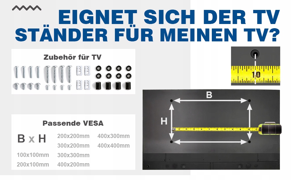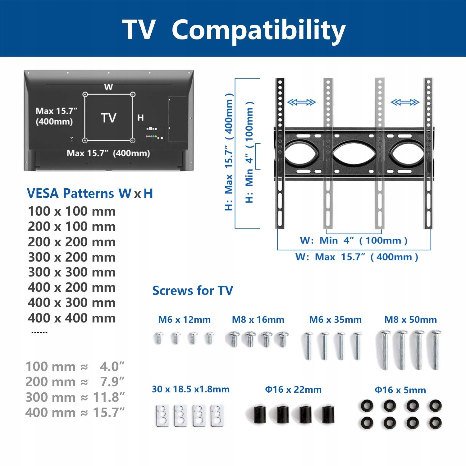 Спочатку перевірте вагу свого телевізора. Він повинен бути менше 35 кг. По-друге, переконайтеся, що ваш телевізор має чотири монтажні отвори на задній панелі, і цей кронштейн підтримує такі відстані між отворами для гвинтів VESA: від 100x100 мм до 400x400 мм. (Наприклад, 100 x 100/200 x 100/100 x 200/200 x 200/300 x 200/300 x 300/400 x 200/400 x 300/400 x 400) Рекомендований розмір 32 36 40 42 43 46 48 49 50 55 58 60 дюймів