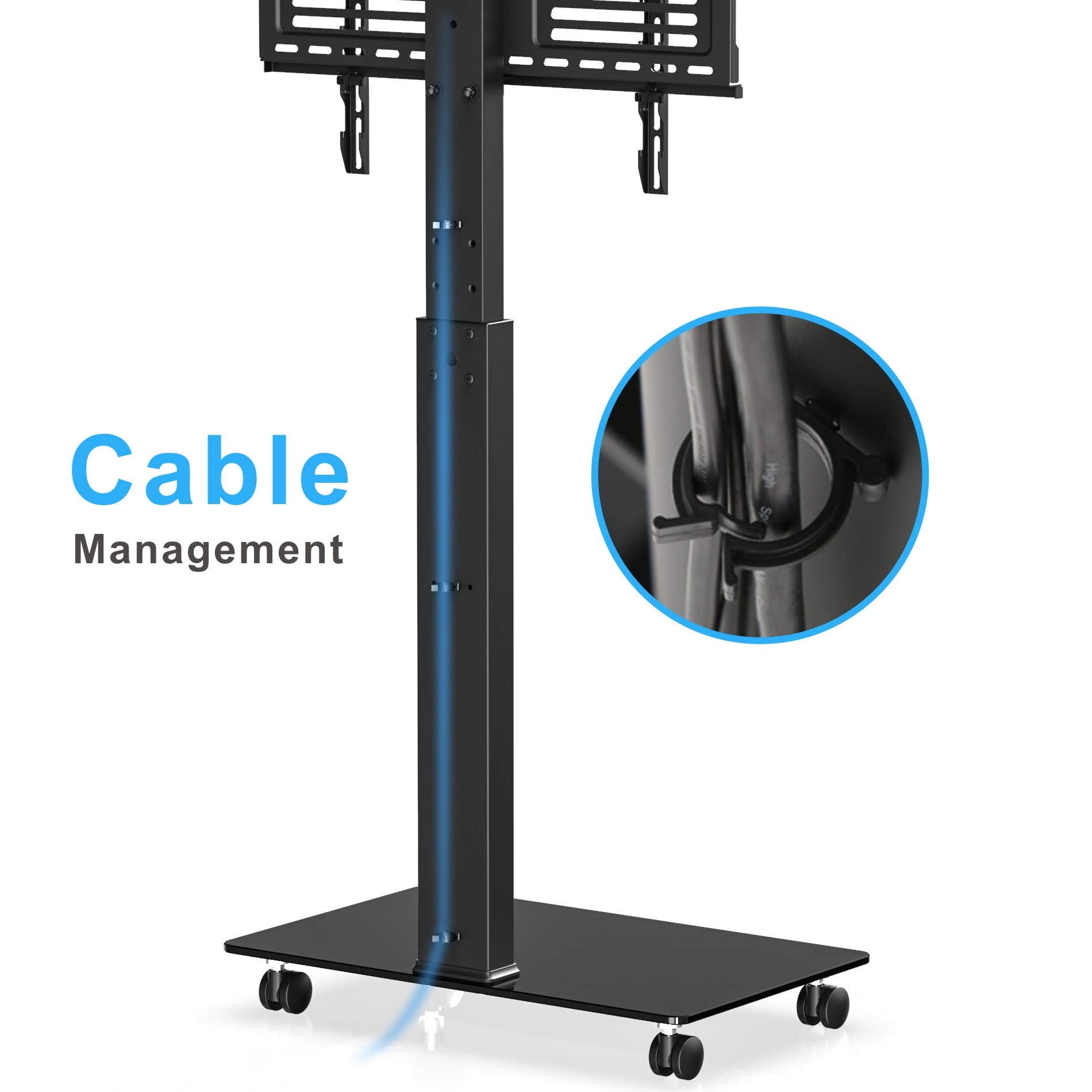 - Багатофункціональність. Задня система керування кабелями може приховати заплутані кабелі й утримати їх від очей. Основа із загартованого скла товщиною 10 мм є гарним вибором для зберігання динаміків, кабельної коробки, ігрової консолі та інших аудіо-відео аксесуарів.