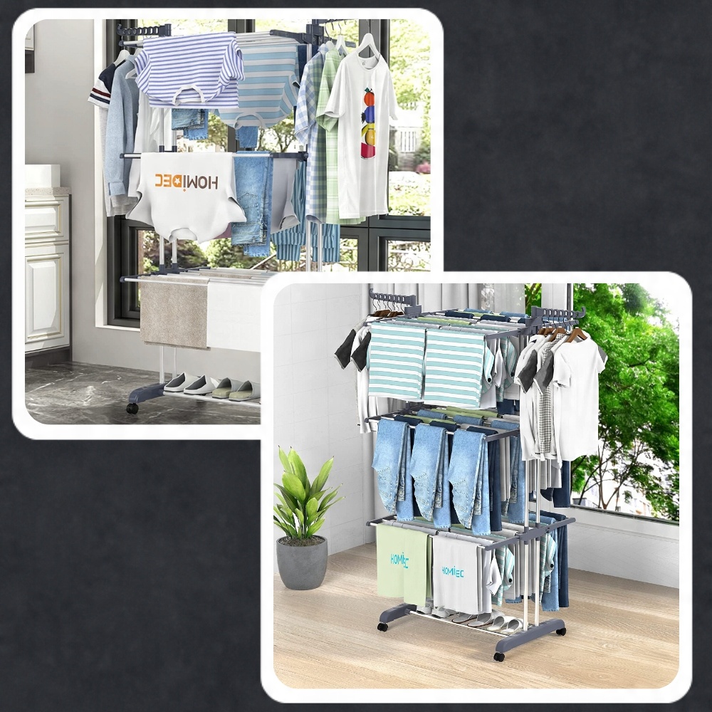 Вертикальна 3-рівнева окремо стояча сушарка для білизни. Завдяки коліщаткам він дуже мобільний, ми можемо легко і швидко переносити його з одного місця на інше. Крім того, колеса мають блокування, тож ми можемо бути впевнені, що сушильна машина буде стійкою та не зрушиться під час пориву вітру чи протягу.