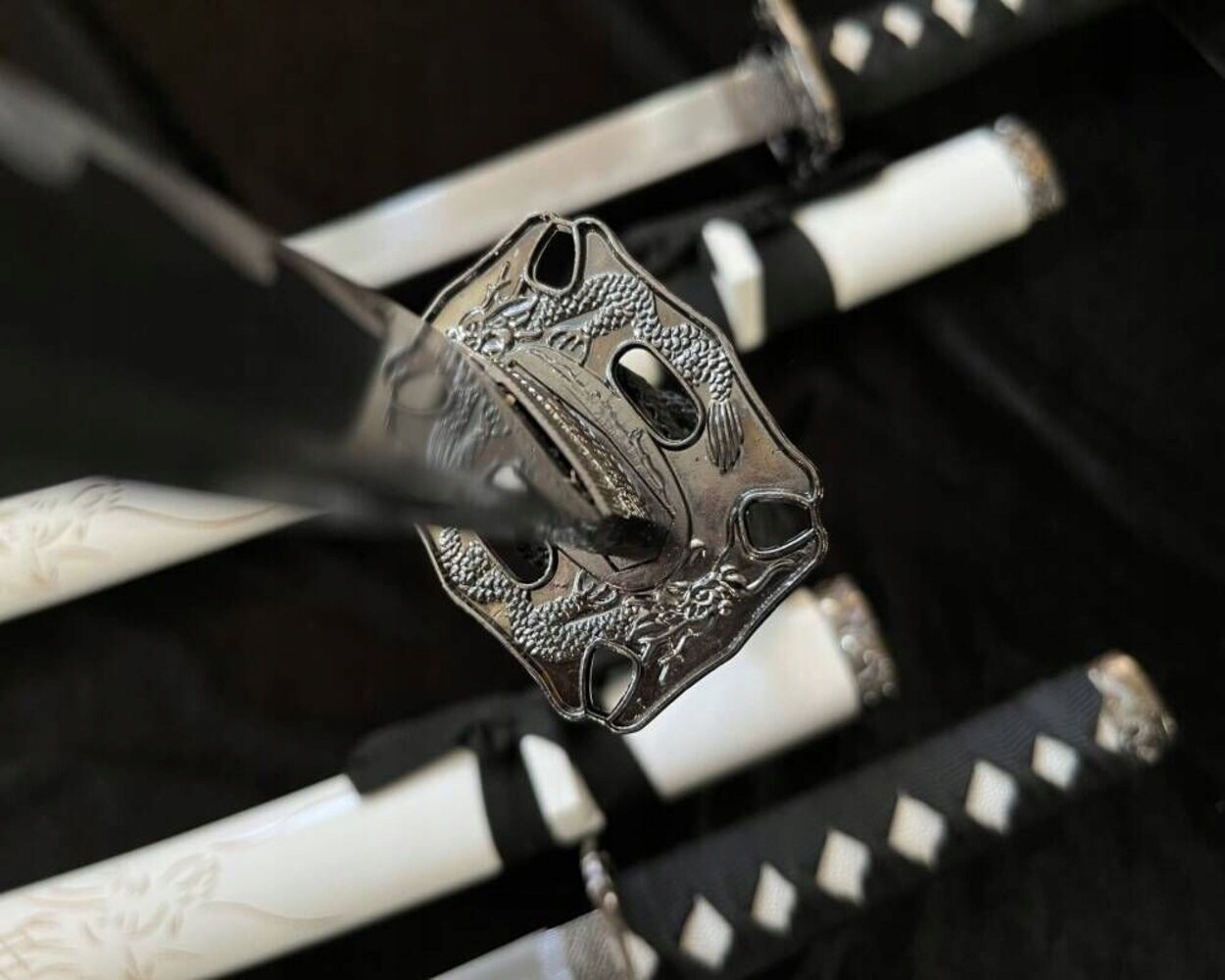 НОЖНИ/САЯ: виготовлені з твердої деревини, бавовняна тасьма сагео та багате гравіювання з драконом з обох боків