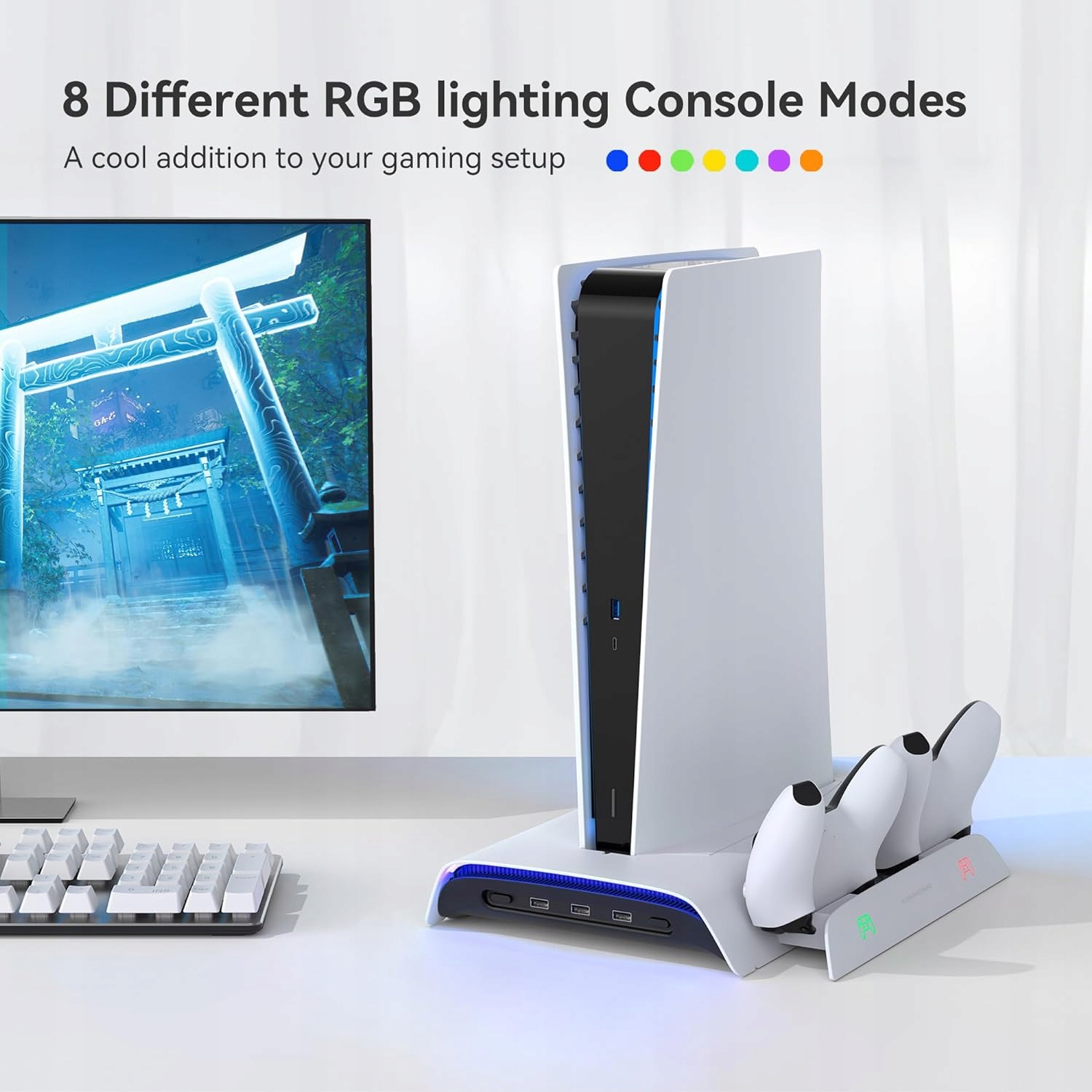 Універсальна підставка для охолодження RGB для СТАРОЇ ВЕРСІЇ PS5Розроблена для PS5 Disc і Digital Edition, оснащена 2 вбудованими вентиляторами з 3 регульованими швидкостями, двома зарядними станціями контролера, 8 яскравими режимами RGB, 10 лотками для ігор, 3 порти USB 2.0, 2 кнопки налаштування, кабель USB-C, охолоджує консоль і тримає все в порядку, чудовий варіант подарунка для тих, хто одержимий PS5. Примітка. НЕ ПІДХОДИТЬ ДО НОВОЇ КОНСОЛІ PS5 SLIM, а нижній вентилятор охолодження не входить.