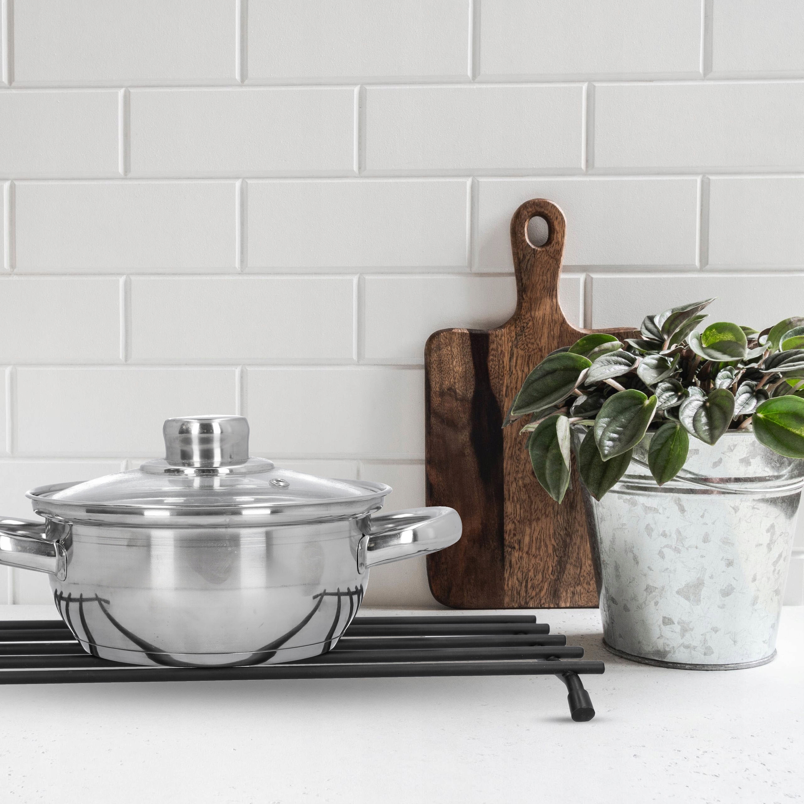 Стійка та елегантна сталева підкладка для захисту поверхні столу від гарячих каструль. Його також можна використовувати як решітку для охолодження випічки. Покритий чорним порошковим покриттям, він стійкий до високих температур і забезпечує тривале використання.