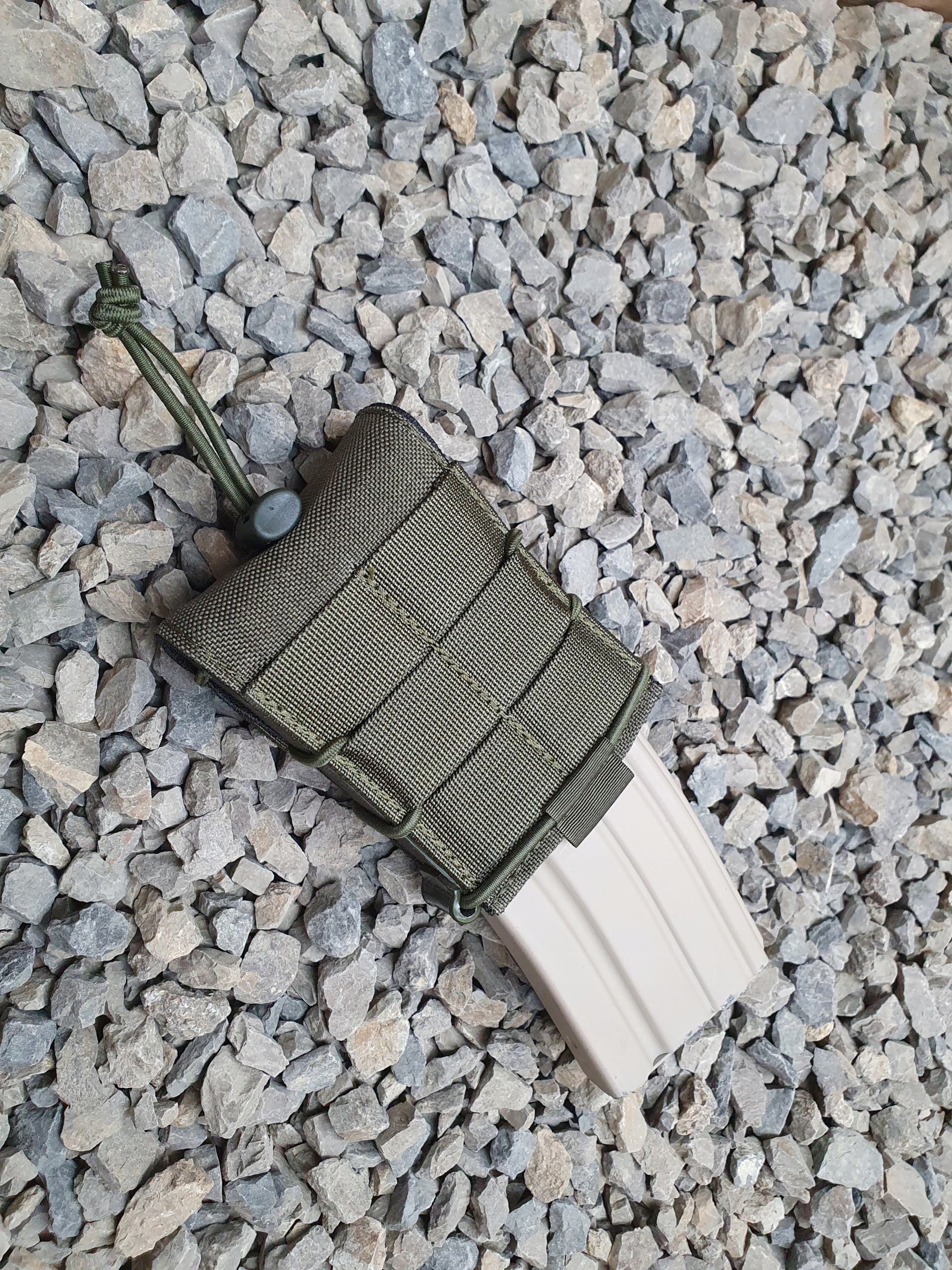 Підсумок для магазинів у стандарті STANAG або подібного розміру з сучасним дизайном. Задня і передня сторони кишені наповнені тонким пінопластом дуже високої щільності, який забезпечує додаткову жорсткість і тиск на гумову нековзку тканину, що утримує магазин. Борти з кайдекса забезпечують високу жорсткість боків і запобігають згортанню отвору, що робить повторне вставлення магазину майже таким же зручним та інтуїтивно зрозумілим, як і його виймання. Крім того, гладка поверхня вставок Kydex з внутрішньої сторони полегшує вставлення та додаткове відкриття сумки, обмотаної еластичним шок-кордом. Однак матова зовнішня сторона надає тактичного вигляду та не відбиває світло.
