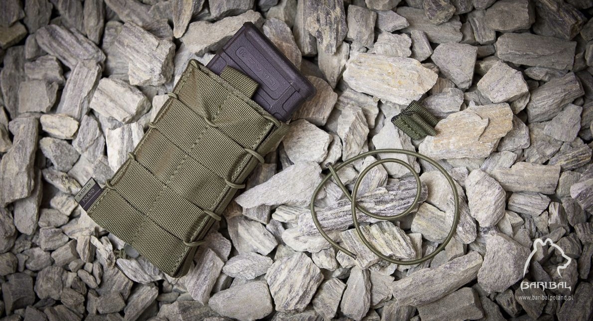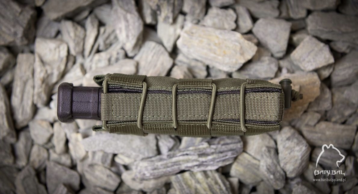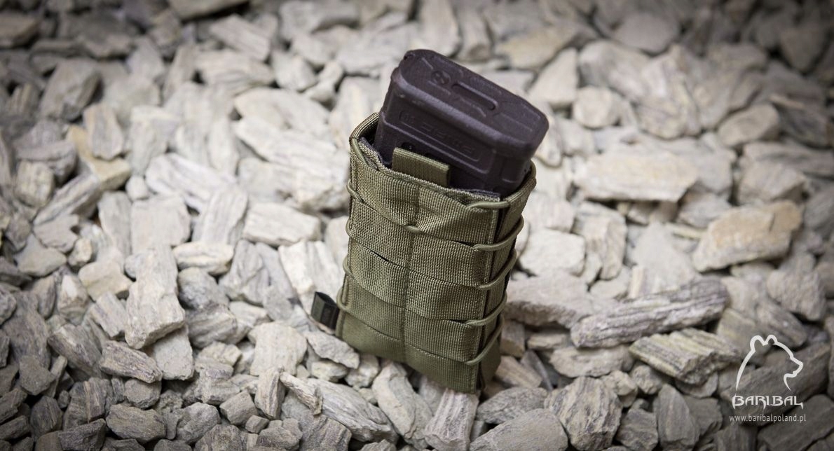 Підсумок із подовженою черепицею, відкритий, призначений для швидкого вилучення магазину. Всередині є гумовий матеріал, який добре утримує вміст. Крім того, силу затиску можна регулювати за допомогою ударного шнура навколо сумки. Довжина була скоригована, щоб відповідати магазинам для зброї M4/M16, але її також можна успішно використовувати з AK та подібними магазинами. Подовжена конструкція забезпечує більшу безпеку під час носіння магазинів без закріплення за рахунок легкості їх вилучення.