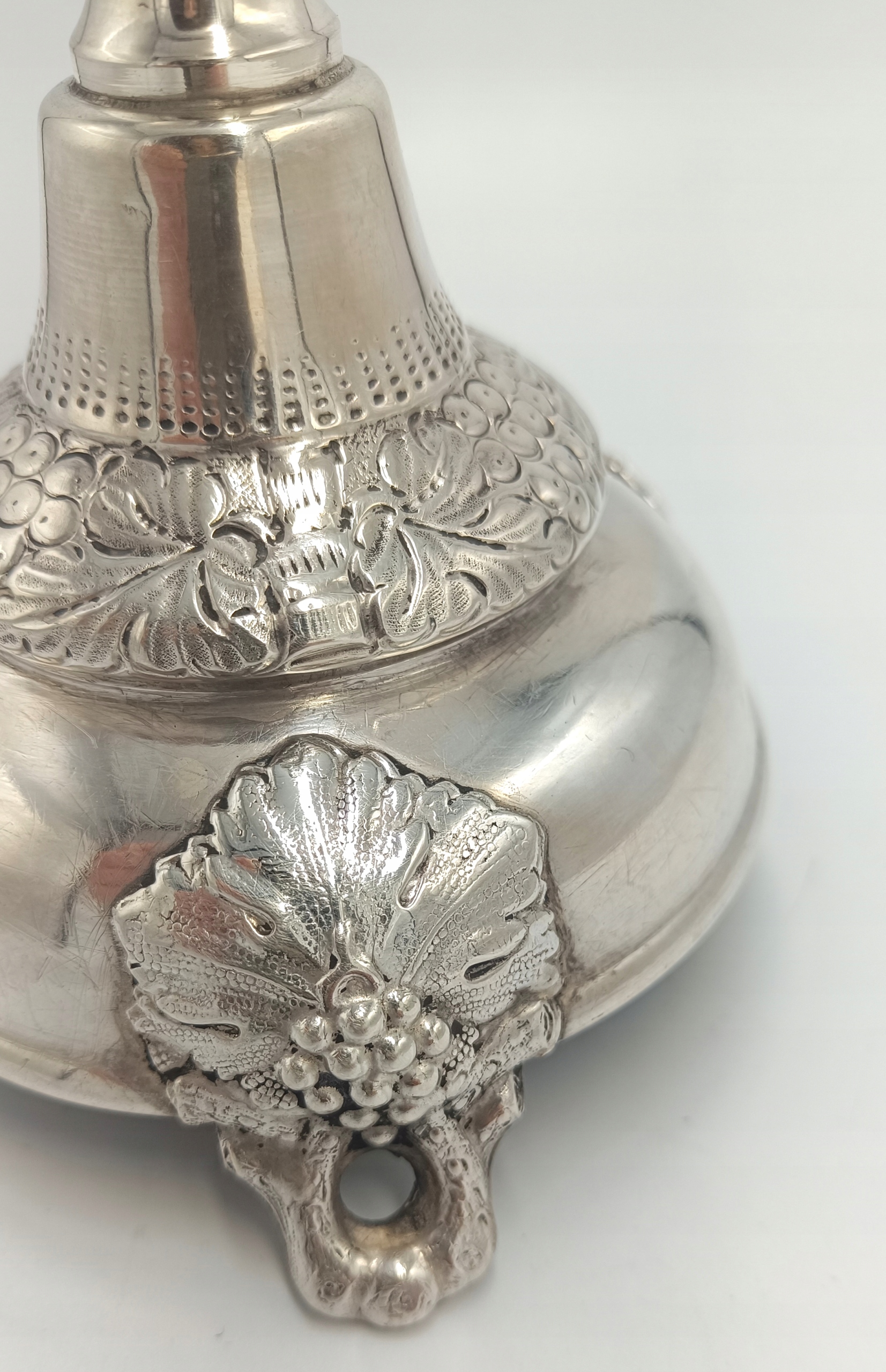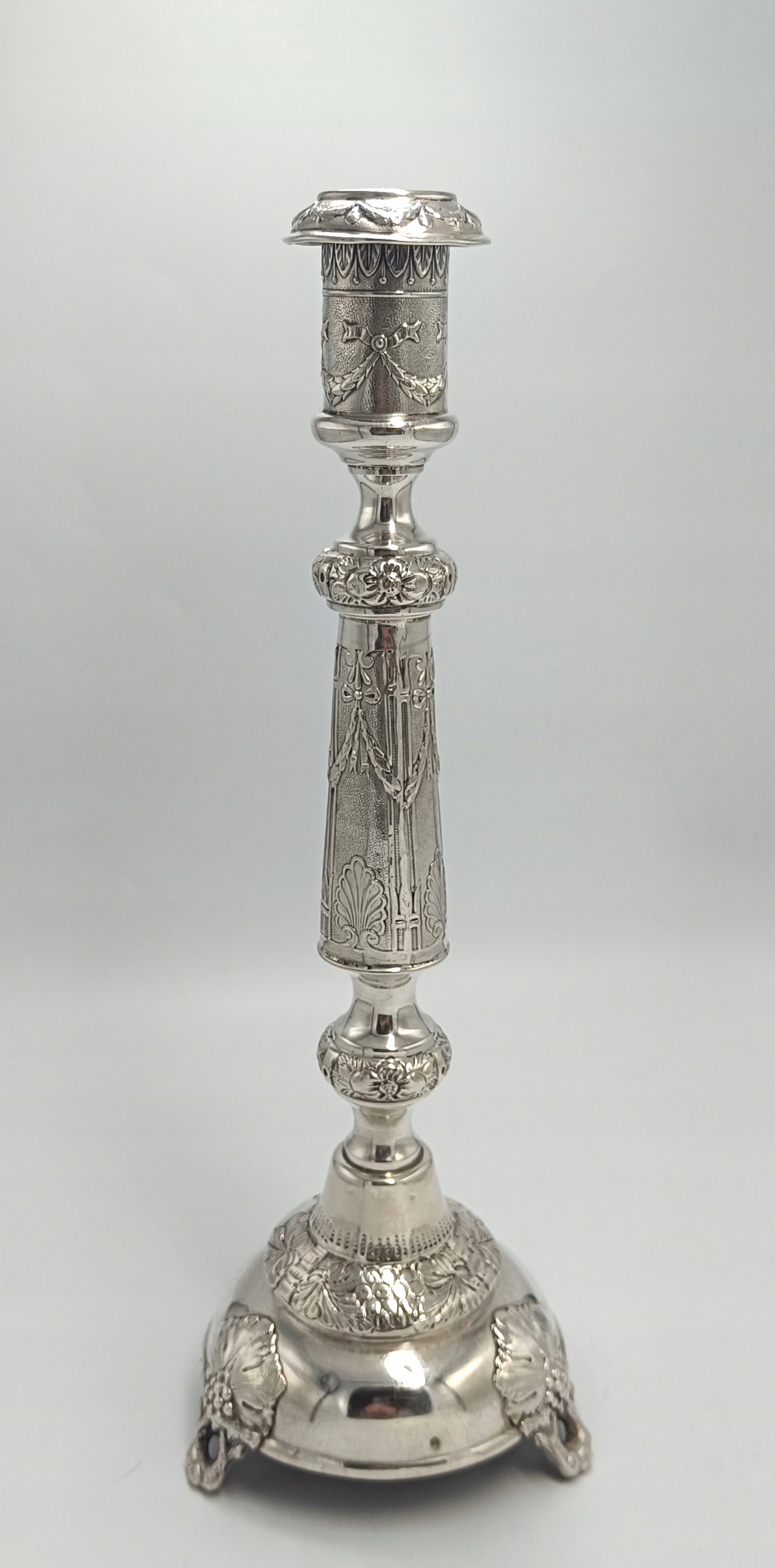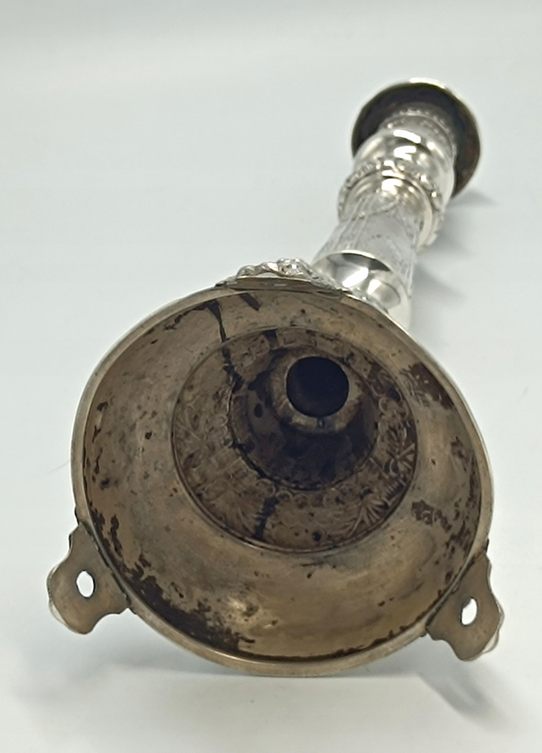 Цей свічник є дуже рідкісним зразком. Він був зроблений повністю сріблом 875 (84), про що свідчить голова голови та число 84 праворуч в Овалі. Свічник був зроблений у Варшавській майстерні Мойсея Принцентала під назвою Мосек, про що свідчить Пунка з його ініціалами М.П. та Пунки з їх торговою маркою у вигляді коня, що виходить на прямокутне поле. Цей лейбл був заснований у 1902 році і діяв до 1939 року, змінивши адреси його штабу - Мурановська, Боніфранка, пробіг, Ніцца.
