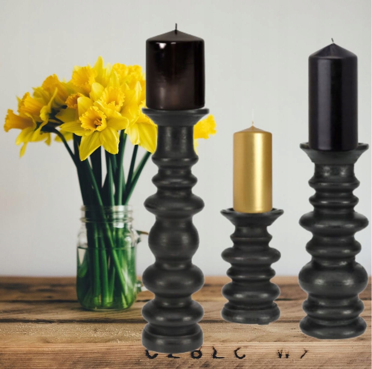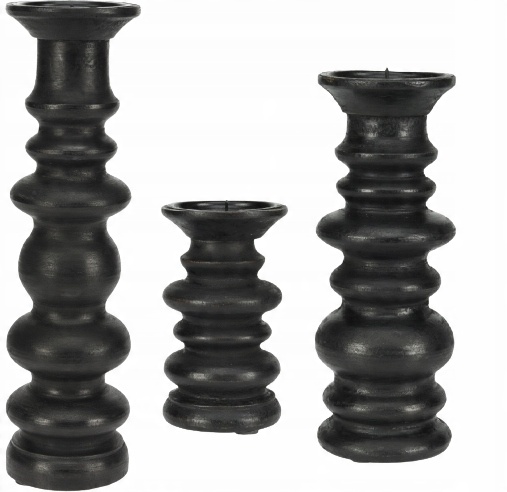 Дерев'яний свічник для однієї товстої свічки. Виготовлений з масиву мангового дерева з тисненням. Пофарбована в чорний матовий колір. Ця модель підходить для скандинавського інтер'єру, бохо, лофт, східного або спа-стилю. Верх підсвічника (основа свічки) захищений металом.