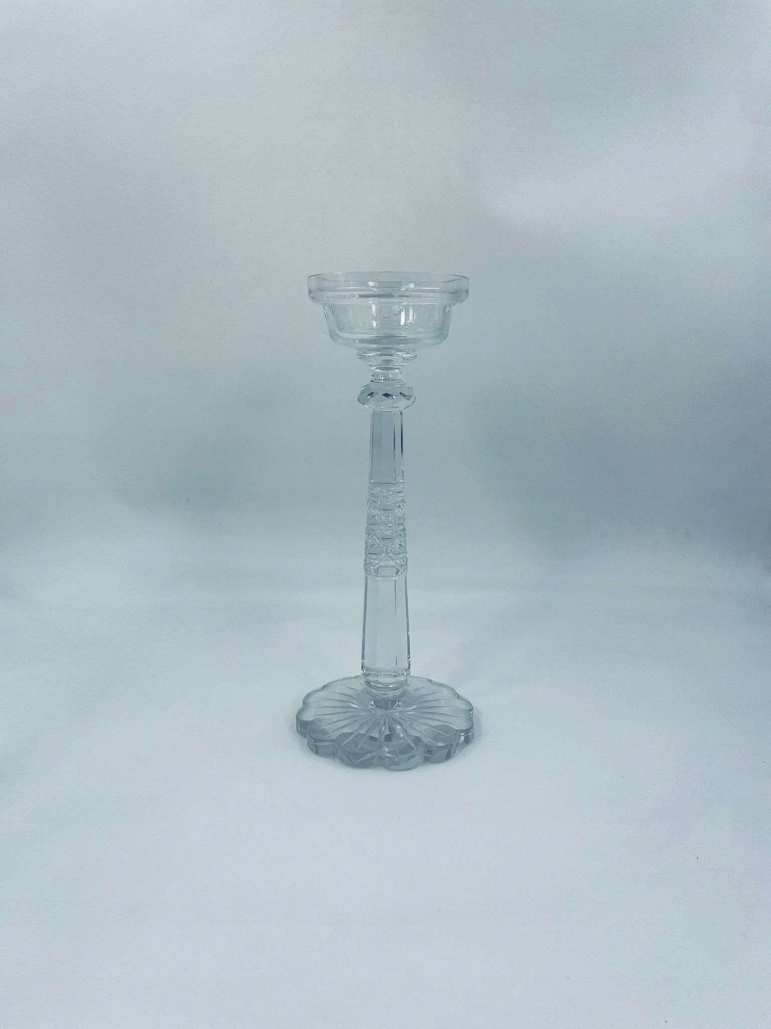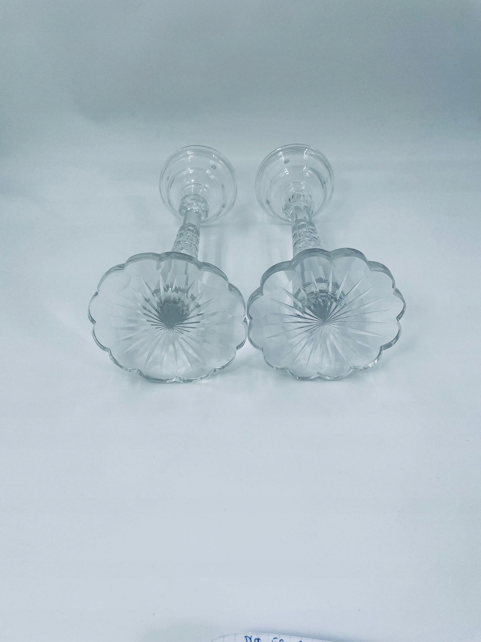 Набір з двох свічників з прозорого кришталевого скла. Вони характеризуються тонкою різьбленою ніжкою та декоративною стійкою основою у формі квітки. Верхня частина свічника пристосована для розміщення більшої свічки. Свічники є декоративним елементом будь-якого інтер'єру, додають вишуканості та блиску. Один свічник має невеликі пошкодження.