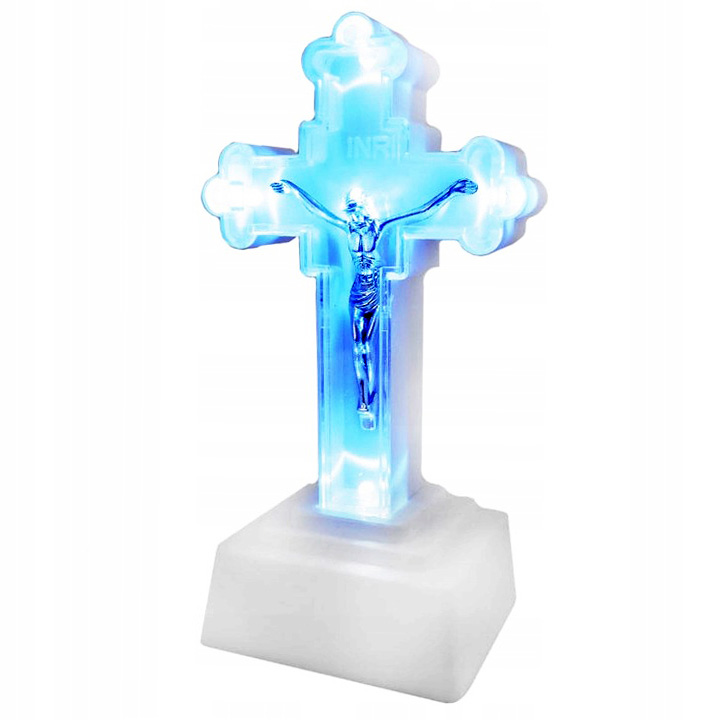 Світова фігурка Ісуса на хресті із пластику. Він світить сильним світлом, створюючи красиве сяйво. Найкраще виглядає в темряві.